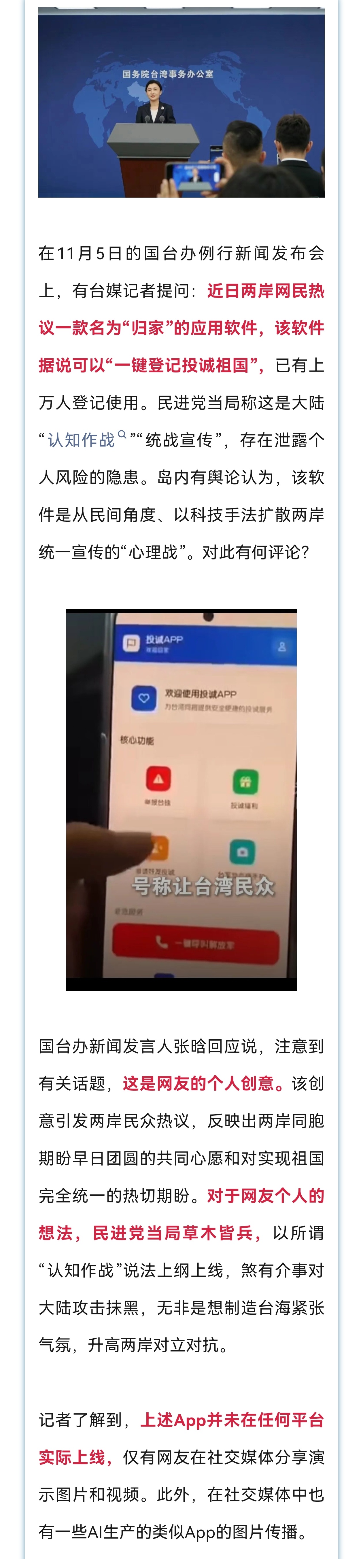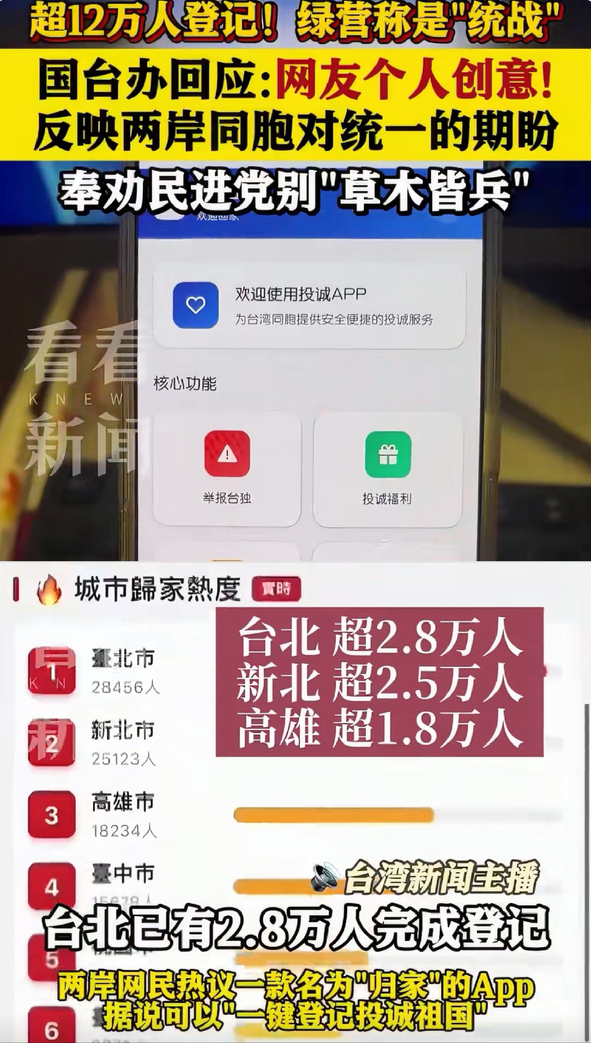 近日,在台湾悄然走红的投诚APP,反映出两岸群众对“盼归”的民心所向,不得不感慨,科技让两岸统一进程加速,台湾当归是大势所趋,近来种种迹象表明,台湾回归可能已进入快车道。说的再直白点,两岸统一不再停留于舆论造势,而是开始谋划路线图和施政构想。时事满谈