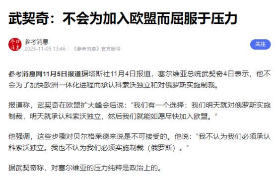 武契奇强硬表态!11月4日,塞尔维亚总统武契奇表示,我做梦也没想到,欧盟竟然给我开出加入欧盟的2个条件!一个是必须加入制裁俄罗斯行列!一个是必须承认科索沃独立! 武契奇称,我要明确告诉欧盟,这2个条件,我一个也不同意!我宁可不加入欧盟,也不会对俄罗斯进行制裁,更不会承认科索沃独立! 武契奇说这话时语气一点不含糊,他甚至直接点破,欧盟这就是赤裸裸的地缘政治胁迫。他坦言,欧盟那边其实明说过,只要塞尔维亚点头干这两件事,一年之内就能进欧盟。可这话听着诱人,实际全是坑。 先说说制裁俄罗斯这事儿,塞尔维亚和俄罗斯的交情摆在那儿,不是说断就能断的。 塞尔维亚的天然气好多都从俄罗斯来,之前两国还签了协议,要把天然气储存能力从4.5亿立方米提升到7.5亿立方米,俄罗斯还投了十几亿美元搞能源项目。 真要是跟着欧盟制裁,自家的能源供应先得崩,老百姓的生活成本肯定蹭蹭涨。武契奇之前就提过,不跟风制裁已经让塞尔维亚付出不少代价,欧盟那边的压力从没断过,甚至有欧盟国家和乌克兰搞虚假炸弹威胁,逼得塞尔维亚的航班多次返航。可他心里门儿清,制裁这事儿违背原则,更损害本国利益,绝对不能松口。 比起制裁俄罗斯,承认科索沃独立这事儿更碰不得。科索沃是塞尔维亚的自治省,这是写在联合国安理会第1244号决议里的,决议明明白白重申塞尔维亚对科索沃的主权。 2008年科索沃单方面宣布独立,联合国压根没承认,塞尔维亚宪法里也写着不放弃主权。武契奇每次谈这事都强调,妥协可以,但必须符合宪法和联合国决议。 对塞尔维亚人来说,科索沃是自家领土的一部分,承认它独立就是背叛国家,这种事儿别说武契奇不同意,全国老百姓也不会答应。 欧盟不可能不清楚这两点的敏感性,塞尔维亚2009年就提交了入盟申请,2012年成了候选国,这些年一直在推进改革,武契奇自己也多次说过,加入欧盟是国家重要目标,能带来经济好处和稳定保障。可欧盟偏偏在这两个底线问题上施压,说白了就是想让塞尔维亚放弃自己的战略自主。 武契奇心里跟明镜似的,他知道欧盟的算盘。俄乌冲突爆发后,塞尔维亚是欧洲少数没对俄制裁的国家,俄罗斯又一直在科索沃问题上支持塞尔维亚。欧盟想通过入盟资格,逼着塞尔维亚跟俄罗斯划清界限,还想彻底解决科索沃问题,把塞尔维亚绑在自己的战车上。 可武契奇没那么容易妥协,他之前就顶着压力,一边维持和俄罗斯的关系,一边推进入盟进程。2024年5月他去莫斯科参加胜利日阅兵,欧盟当即警告会影响入盟,他后来访问乌克兰示好,却始终没松过制裁和科索沃的口子。这次欧盟把条件摆上台面,他干脆直接摊牌。 他在讲话里特意强调,政策得塞尔维亚自己定,不是别人说了算。这话里藏着太多无奈,也透着一股硬气。塞尔维亚夹在欧盟和俄罗斯之间,这些年一直在走钢丝,可再难也不能丢了原则。加入欧盟是为了让国家更好,要是得用主权和盟友换,那这欧盟不入也罢。 现在欧盟还没明确回应武契奇的表态,但明眼人都看得出来,这两个条件根本没留商量余地。武契奇敢这么硬气,不光是因为自己有底气,更是摸准了塞尔维亚人的心思。之前他因为拒绝制裁,就算被骂“叛徒”也照样高票连任,老百姓心里都清楚,什么对国家真正重要。接下来塞尔维亚和欧盟的拉扯肯定还得继续,但武契奇已经把话放这了,底线面前,没得谈。 来源:参考消息 【武契奇:不会为加入欧盟而屈服于压力】
