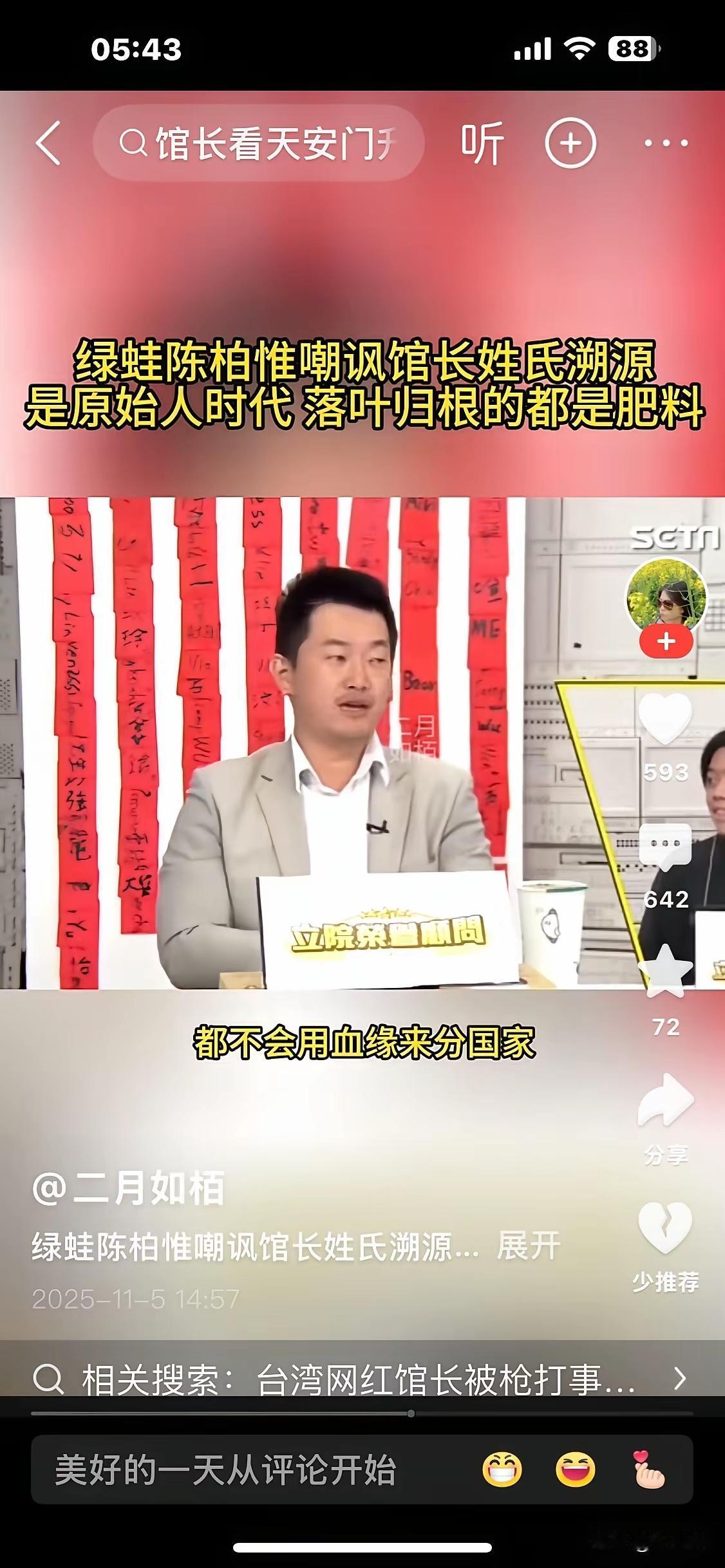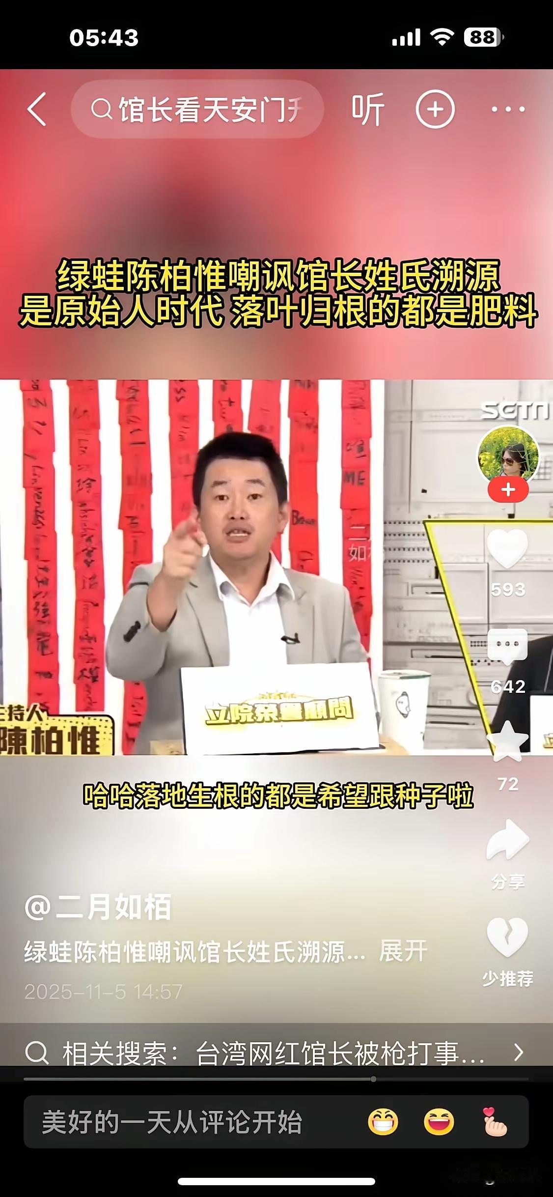 台湾馆长大陆行结束了,其中替赖清德寻根之旅,绿营静默了两天开始了反击,绿营名嘴陈柏惟、于北辰纷纷跳岀来指责,并指所谓独派已"落地生根",而统派请"落叶归根",去掉台湾身份并离开台湾。 但是我们要告诉这帮台独分子的是台湾的根就是中国,而不是台独,陈柏惟偷换了概念。 网友:台湾岛没有真正的台独 只有个人利益派。 美国日本对台湾的个别团体和组织长期的金援才是主因。统一以后这些人失去了个人利益。 落地生根没有错,但是不能落在中国的土地上还不承认是中国人,那就赶到海里去,在海里去生根,还不能是中国领海! 台独分子为了继续愚弄、欺骗台湾民众,故意“发明”什么如:台肯、台秋节、落叶生根等词………