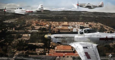 开国大典, 空中视角, 第一次见! 因为国民党趁解放军还没有建立起有效防空前,派B-24轰炸了南苑机场,所以当天的受阅飞机都是挂弹起飞。 同时,负责空中警戒。 想起来小时候看到的一个趣闻,当时战斗机数量较少,于是周总理就安排飞机队飞了3圈。