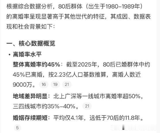 80后有45%的人已经离婚?80后离婚人数9000万? 国内的AI想要做到和人一样回答问题,还是挺难的。 因为想要AI回答正确的,前提是要有大量正确的数据导入,然后AI才能根据收集来的数据去回答问题。 但是国内很多数据,都是自媒体或者私人机构发的数据,大部分都是假的。 那么AI在网上搜的数据本身就是假的,以假数据回答的问题,那肯定是有问题的。 像是有人问这个离婚率的问题,AI就直接把一个瞎编的自媒体数据给回答出来了,说80后里面已经有9000万的人离婚了,离婚率达到了45%[允悲]