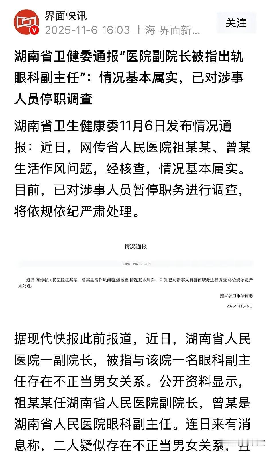 湖南医院那视频真的刷爆全网! 手握国家级项目的副院长、妙手回春的眼科主任,俩医疗界精英栽在私德上,真是让人唏嘘到骨子里。 没人否认他俩的医术, 患者口中的耐心问诊、高难度手术成功案例,都是实打实的成绩。 但上班时间在值班室用无菌垫搞亲密行为,还牵扯出职称评审的关联, 这就不只是私生活那么简单了。 网络上没往医德上死磕, 恰恰说明大家心里有杆秤:治病救人的本事值得认可,但职业操守不能打折扣。暂停职务调查是该有的态度, 可培养一个顶尖医生多不容易, 直接吊销执照又怕寒了从业者的心。 私德有亏该罚,但能不能别一棍子打死?毕竟患者要的是能看病的好医生,不是完美圣人。 你觉得他俩该被终身禁医吗?