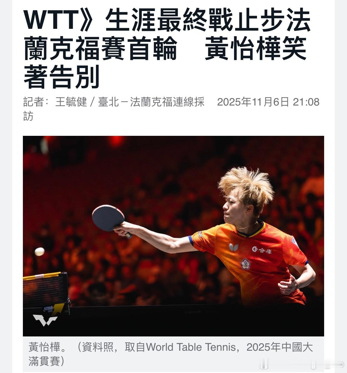 【台媒】生涯最终战止步法兰克福赛首轮 黄怡桦笑着告别2025年WTT(World