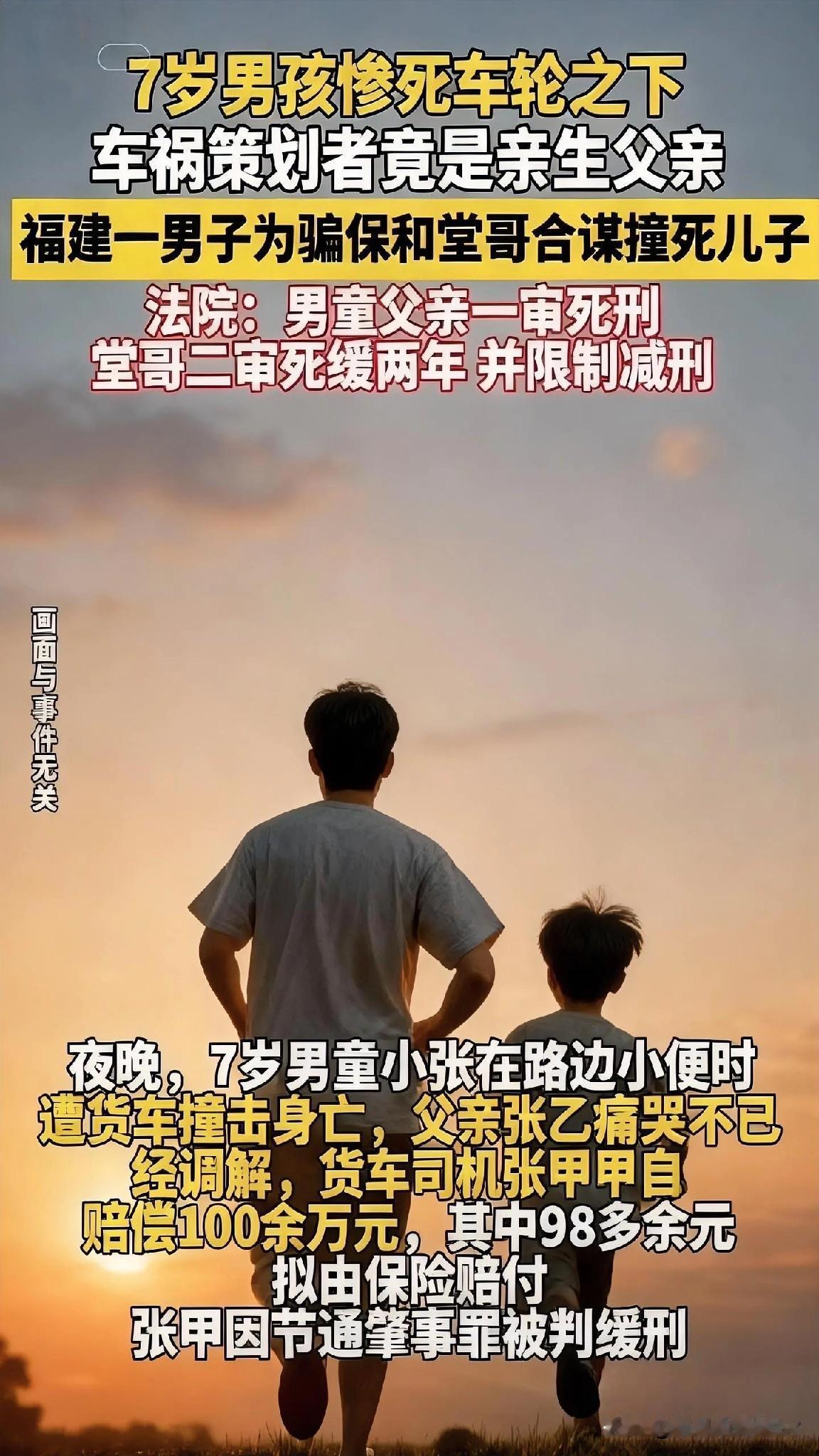 福建杀子骗保案二审落槌!亲生父亲伙同堂哥弑子骗保98万,死刑判决引深思 从杀妻骗保到弑母骗保,如今连亲生骨肉都成了谋财工具。罗翔那句“还有什么比人更可怕”,在这些悲剧里显得格外沉重。 2025年11月,福建省高级人民法院公布二审裁定书,一起骇人听闻的“杀子骗保”案尘埃落定。三明市尤溪县男子张乙因妻子出轨、家庭经济拮据,竟与堂哥张甲合谋,制造交通事故夺走7岁亲生儿子小张的性命,妄图骗取98万余元保险赔偿金。 2020年10月30日晚,国道G235线尤溪段发生“意外”车祸。张乙驾车载儿子停靠路边,让孩子下车小便时,堂哥张甲驾驶重型货车径直撞击,导致小张当场死亡。两人刻意隐瞒亲属关系,谎称因导航分心引发事故,交警最终认定张甲全责,调解赔偿100.5万元,其中98万余元拟由保险赔付。 事发后,张甲因交通肇事罪获判缓刑,保险公司支付交强险18万元,张乙分给张甲3万元。但因张甲持假道路运输从业资格证,保险公司拒赔商业险,货车车主罗某被判赔偿79万余元。罗某偶然从朋友叶某处得知,张乙曾试图教唆其“撞死患病儿子骗保”被拒,遂向警方举报,揭开这起蓄意谋杀的真相。 法院审理查明,张乙早在2020年3月就萌生杀子骗保念头,找叶某未果后,又以儿子“患病无法医治”说服堂哥合作。二人提前约定作案地点和时间,选择无监控路段动手,案发后伪造现场、隐瞒关系。2024年6月,三明市中院一审以故意杀人罪、保险诈骗罪数罪并罚,判处张乙死刑,张甲死缓并限制减刑,二审法院最终维持原判。 罗翔曾说“还有什么比人更可怕”,这话在这起案件中令人脊背发凉。从杀妻骗保到弑母骗保,再到亲生父亲对幼子痛下杀手,贪婪让亲情沦为金钱的祭品。 一位客户曾跟我坦言,他从不跟儿子透露自己的保险和理财情况,不是不信任,而是见过太多人性的复杂,怕财富变成伤害自己的隐患。 保险公司对理赔审核的严谨性在本案中显现无遗,假资格证成为拒赔关键,也间接推动了真相大白。那些妄图用亲人生命换钱的人,终究逃不过法律的严惩。 当亲情可以被98万保险金衡量,当血缘抵不过贪婪的诱惑,这样的悲剧如何才能杜绝?你怎么看待这起案件中的人性之恶?来评论区说说你的看法。