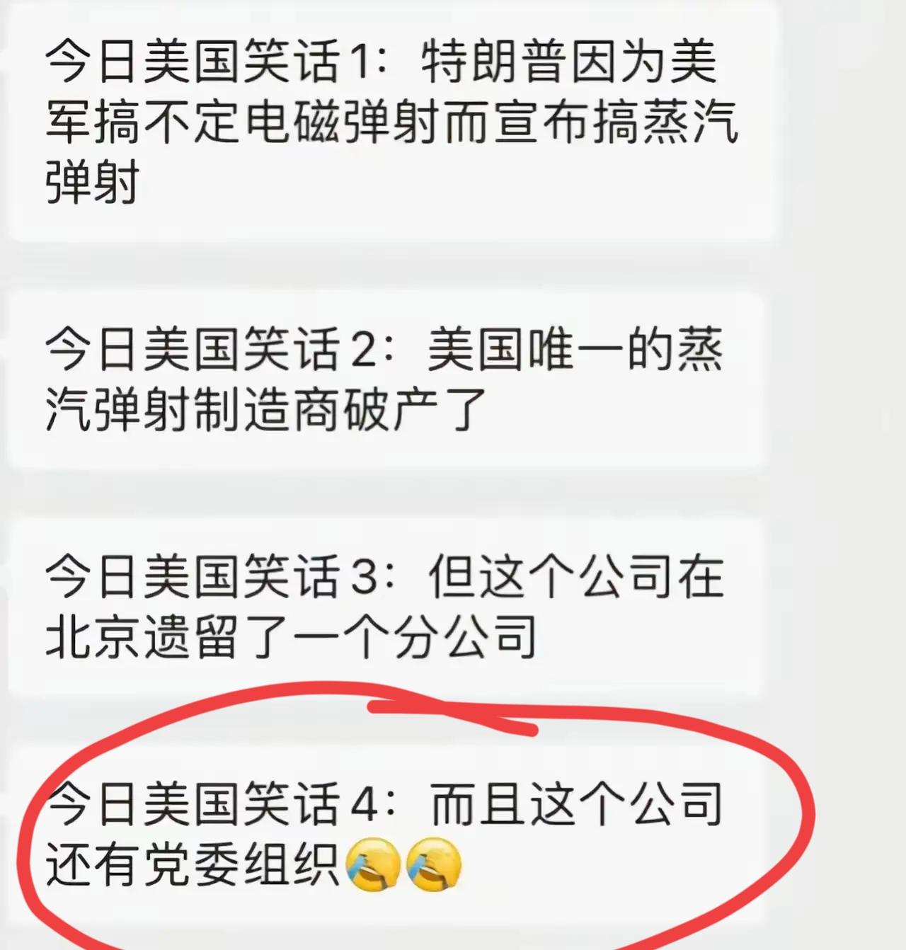 哈哈,金灿荣老师也被伤到了。好事不在忙上,这么多年都等过去了,也不在乎这一两天。 鹰子家的老福,不说几天时间,就算再给他几年,他也还是现在这个怂样。 税宗不是说要给老福换成蒸汽弹射吗? 电磁没有烟火气,没有氛围感。然而……你家电磁不行,蒸汽弹射的制造商也倒闭了。 不过幸运的是它还保留了一家分公司。 不过据说在我们家北京,而且还成立了党委组织。[捂脸] 我知道这样拉踩友商不太好,但是我很爽啊![笑哭][笑哭][笑哭] 点右上角关注我,我们一起去看这个魔幻的世界