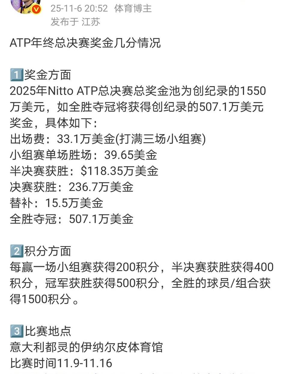 鸡鸭同组!阿卡签运不错,年终第一应该能保住;辛纳紫薇再次相遇,药加辛随便打打就能出线。 最终辛卡会师决赛,药加辛夺得年终总决赛冠军,阿卡夺得年终世界第一,大家皆大欢喜。 药加辛大概率全胜夺冠,奖金507.1万美元。想一想这1个月他进账了多少,六王表演赛600万美元,巴黎大师赛近120万美元……