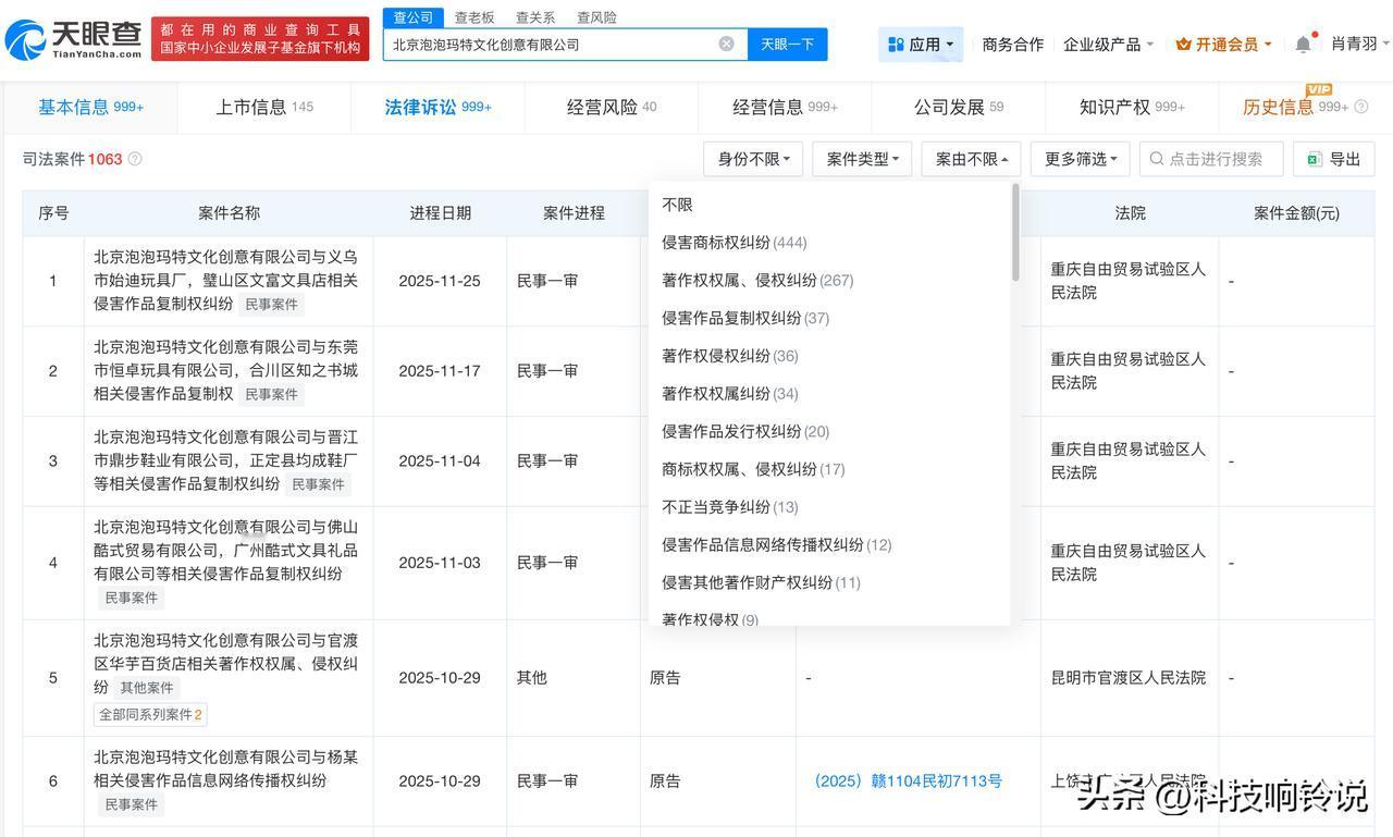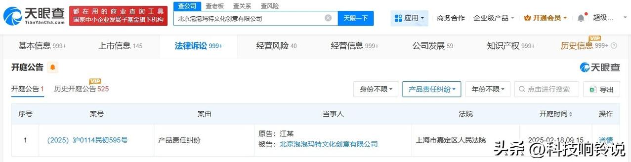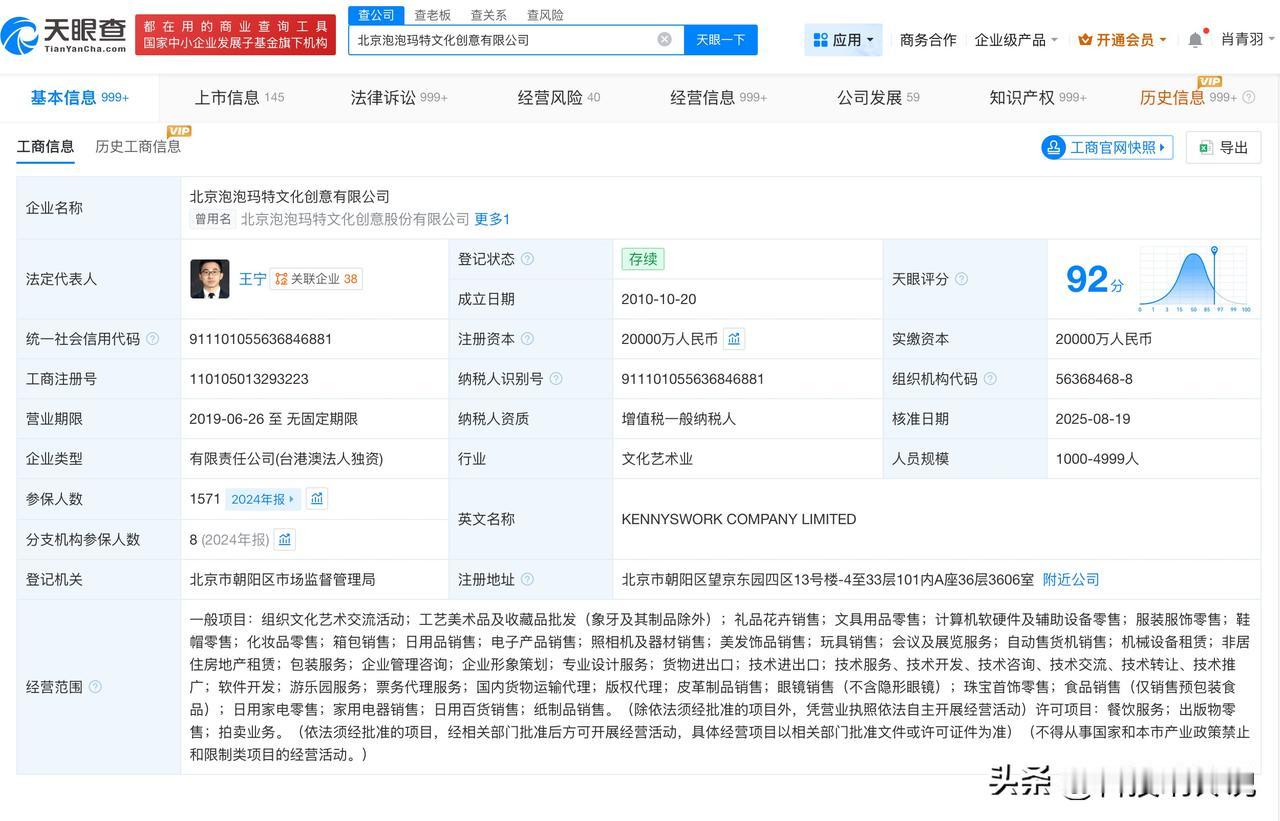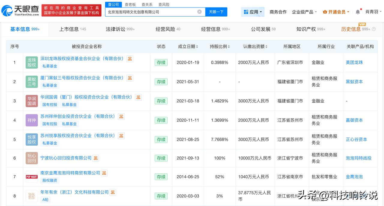 【泡泡玛特涉多起法律纠纷 泡泡玛特商业版图盘点】泡泡玛特直播事故 11月6日,有网友发现泡泡玛特员工在直播时,一人说:“哎嘛,这东西卖79确实有点......”,另一个工作人员说:“没事会有人买单的”。对话被实时播出,引发消费者不满。 天眼查App显示,泡泡玛特关联公司北京泡泡玛特文化创意有限公司成立于2010年10月,法定代表人为王宁,注册资本2亿人民币,经营范围包括包装服务、企业管理咨询、企业形象策划、专业设计服务、货物进出口等。股东信息显示,该公司由POP MART(HONG KONG)HOLDING LIMITED全资持股。对外投资信息显示,该公司持股30余家企业,包括南京金鹰泡泡玛特商贸有限公司、上海葩趣文化创意有限公司等。通过直接或间接持股,该公司实控59家存续企业。 天眼风险信息显示,该公司涉及多起法律诉讼,案由多为侵害商标权纠纷,案件身份多为原告。值得注意的是,今年2月,该公司曾因产品责任纠纷被江某起诉。 天眼查信息: