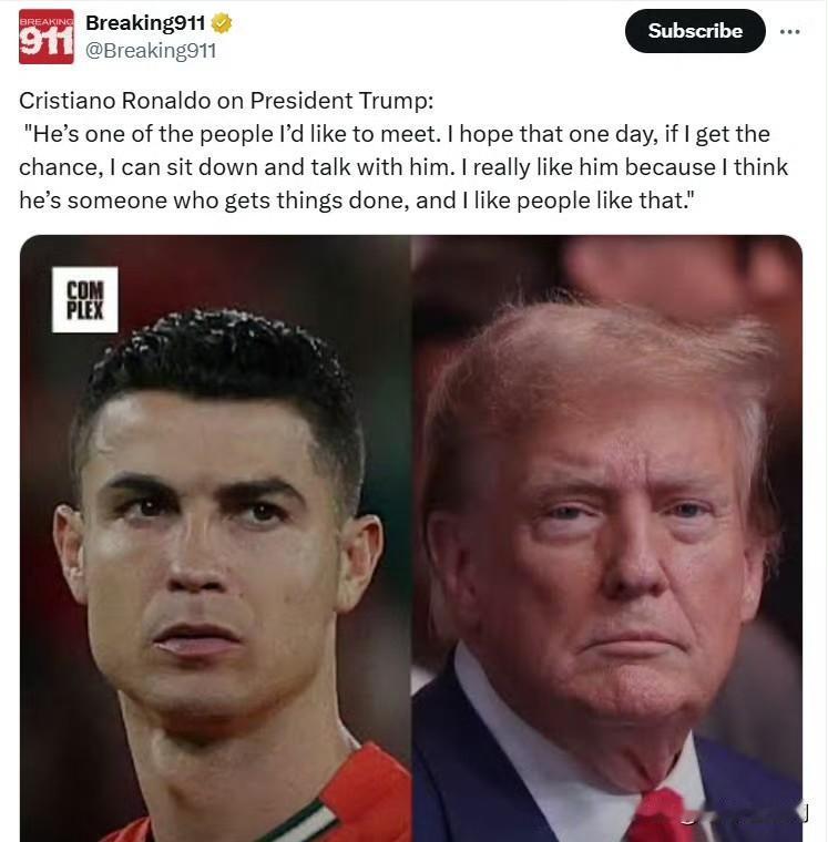 C罗谈特朗普总统: “他是我很想见的人之一。我希望有一天,如果有机会,我能和他坐下来聊聊。我真的很喜欢他,因为我觉得他是一个能把事情办成的人,而我喜欢这样的人。”