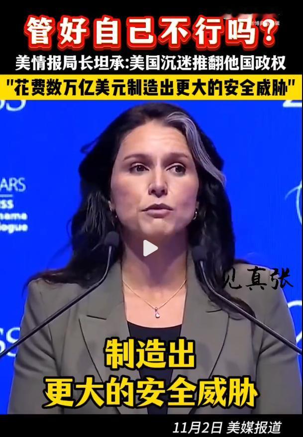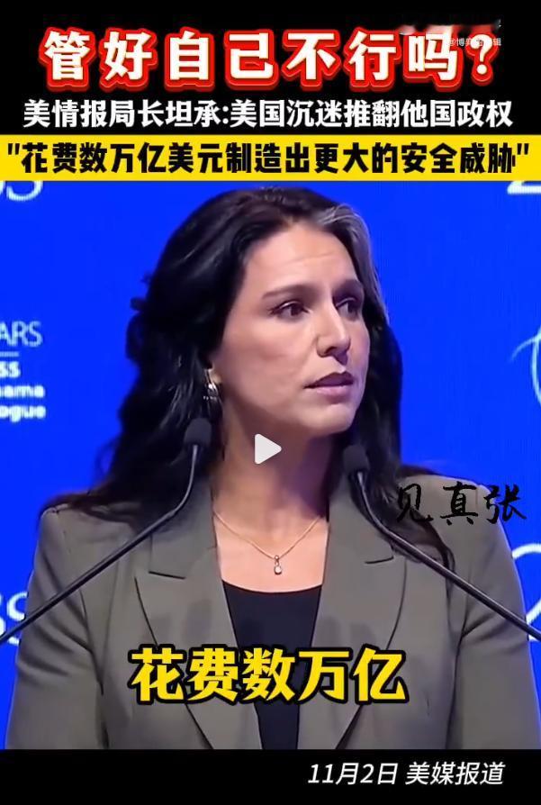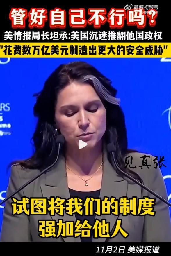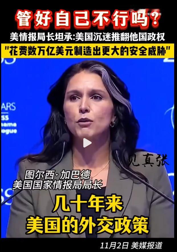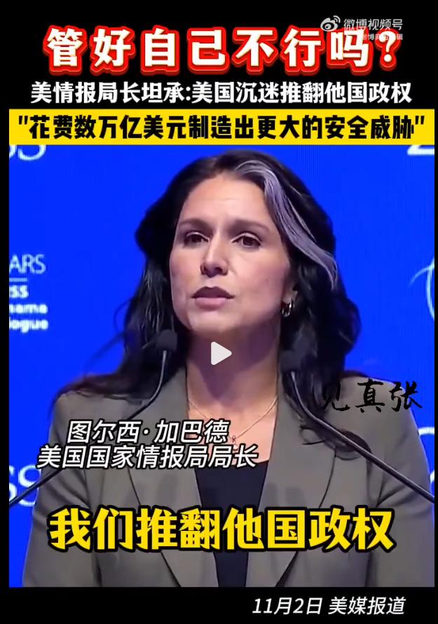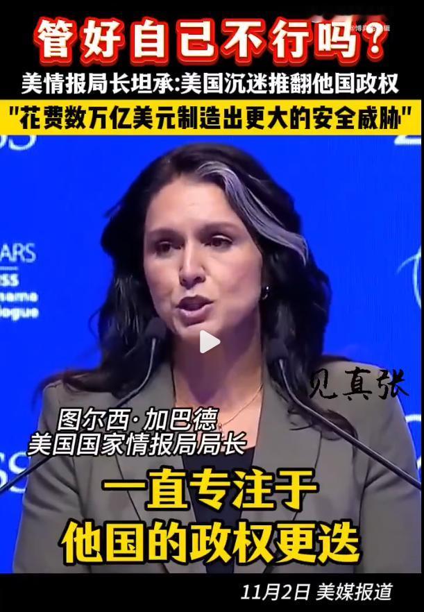 美情报头子突然认错:我们沉迷推翻别国政权!花费数万亿美元制造出更大的安全威胁 美国国家情报总监加巴德,最近在公开场合说了句大实话:“美国沉迷于推翻其他国家的政权。”她还算了一笔账,结果发现,花了好几万亿美元,而给自己制造了更大的安全威胁。 这话从美国情报体系最高负责人嘴里说出来,分量不一般。等于官方亲自盖章,承认过去几十年满世界点火的操作,纯属搬石头砸自己脚。 但这事细想很有意思:她为什么偏偏在这个时候坦白? 要我说,这不是良心发现,而是真撑不住了。 看看现在的局面:俄乌那边僵持不下,巴以这边火星四溅,红海航路不太平,咱们东大这边稳步发展。美国以前那套“打一个、拉一个”的玩法,彻底不灵了。 他们当年推翻萨达姆,觉得能控制伊拉克,结果冒出更多地方武装;搞乱叙利亚,难民潮直接冲击欧洲;在阿富汗经营二十年,最后撤退那场面,全世界都看着笑话。 加巴德这话,表面是检讨,实则是在诉苦:地主家也没余粮了,这四处救火的日子,过不下去了。 不过,她这番话在美国上层来看,不亚于一道惊雷。 那些老政客们第一个不答应。你这么说,不等于承认我们过去二十年的对外政策全错了吗? 那些军火商更不乐意——不在外面乱搞,我们最新款的导弹卖给谁?F-35的订单从哪来? 但是对普通美国人来说,税人的钱难道就用来在千里之外制造仇恨?为什么不用这些钱美国的道路、美国的学校?” 说到底,美国这套“推翻政权”的瘾,背后是三个戒不掉的毛病。 第一是军工复合体的瘾。不开战,不搞乱,军火商怎么赚钱?国会山上那些议员的政治献金从哪来? 第二是美元霸权的瘾。不乱,资本怎么回流美国?怎么维持美元的特殊地位? 第三是救世主心态的瘾。总觉得自己是天选之子,有义务帮别人“重塑国家”。 但现在,这三样都玩不转了。 军火商发现,面对无人机、高超音速导弹这些新玩意,他们那些传统装备越来越卖不动;美元霸权受到数字货币、本币结算的冲击;“美国模式”的魅力,在年轻一代眼里大打折扣。 最让他们难受的是,世界已经看透了这套把戏。 现在很多地区强国都学聪明了——你想来推翻我?我先用廉价无人机消耗你,用非对称战法拖垮你。等你花了几万亿、死了大兵、国内反战声音四起时,自然就撤了。 而且现在大国之间博弈,讲究的是产业链、科技、经济融合。谁还陪你玩那种粗放的政权更迭游戏? 所以说,加巴德这番坦白,看似主动认错,实则是被迫承认一个事实:美国那套横行世界八十年的玩法,到此为止了。 这不是他们想收手,而是时代变了,实力也不允许了。 接下来我们会看到美国更多类似的“反思”和“战略收缩”,但千万别被他们骗了——这不是真心悔过,而是实力不济下的战术调整。