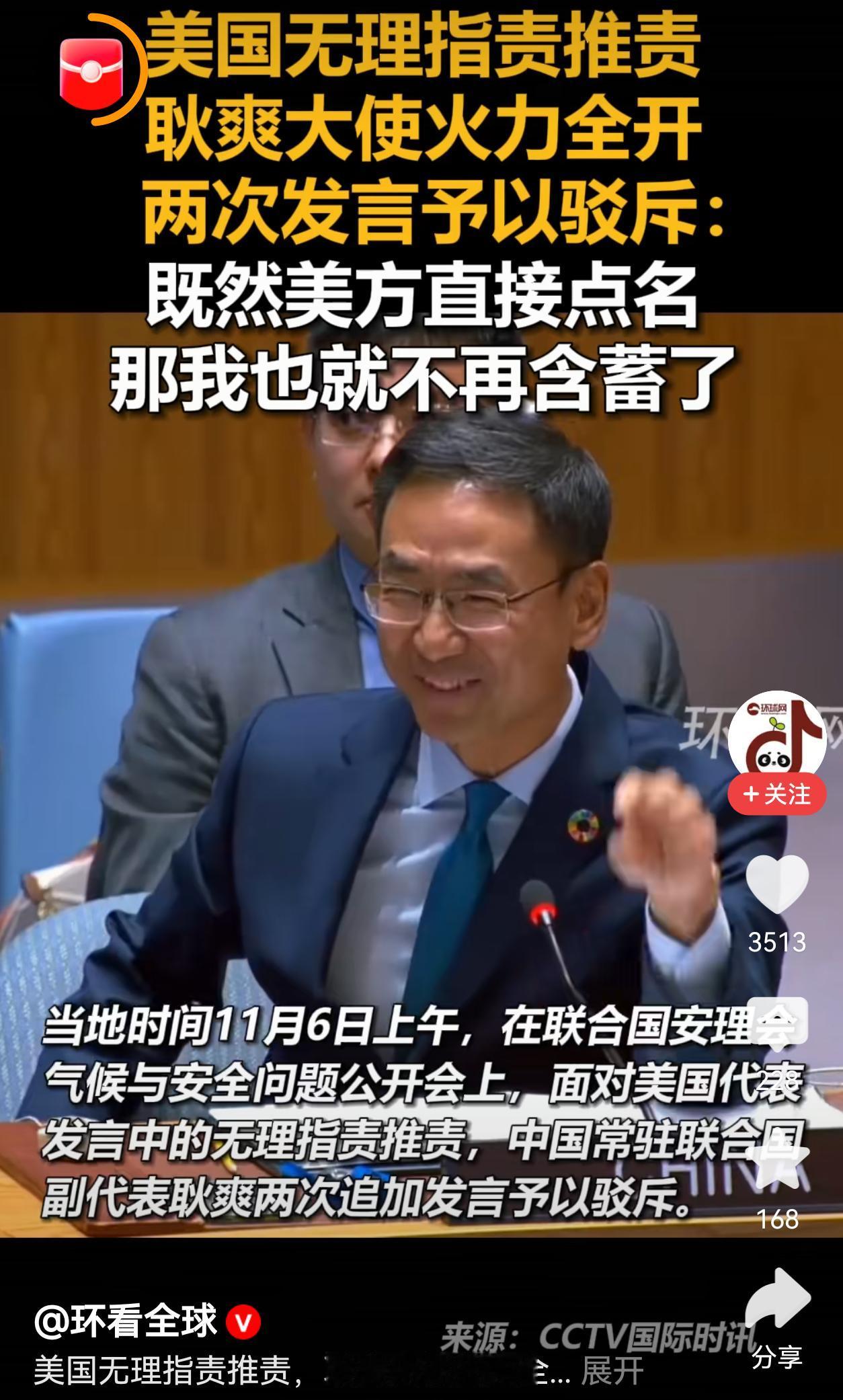 耿爽在联合国安理会气候与安全问题会议上对美方火力全开前的这个笑容,看着太让人解气了!老美终于上套了,耿直直接开大, 美国既然已经直接点名中国了,那后面的说话也不用含蓄了!尽管中国是世界上碳排放量最大的国家,但是中国是世界上第二大经济体,经济总量庞大,对世界经济的增长贡献巨大,更是世界公认的对减少碳排量意志最坚定的国家,更是在这方面执行上公认做的好的国家, 相反,美国两次退出巴黎气候协议,更是鼓吹气候变化是最大的骗局,美国不仅在减少碳排量上不多做努力,反而不断增加阻力,面对气候变化,到底是谁在采取行动,谁在推卸责任,一目了然! 这段话火力全开,赢得一片叫好,中方更是呼吁面对气候问题要团结和合作,而不是推诿和阻碍!不知道当时美方代表的脸色到底是怎么样的,哈哈哈,太爽了!