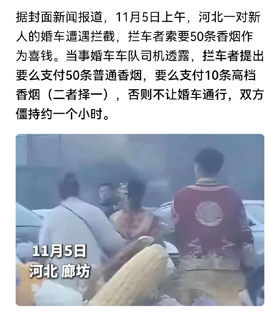 索要50条烟就是趁喜打劫! 拦车讨喜早就不是讨个彩头,而是借着婚礼的软肋明抢,就是披着民俗外衣的敲诈。这根本不是什么“风俗”,风俗是让人舒服的、传递善意的,而不是带着强迫性的强买强卖!它把原本温暖的民俗给搞臭了,现在一提拦婚车,大家第一反应不是喜庆,而是反感、警惕,真正的传统习俗反而被这种恶俗拖累。 这不是钱的问题,是凭什么别人的人生大事,要被一群陌生人用无赖手段绑架?