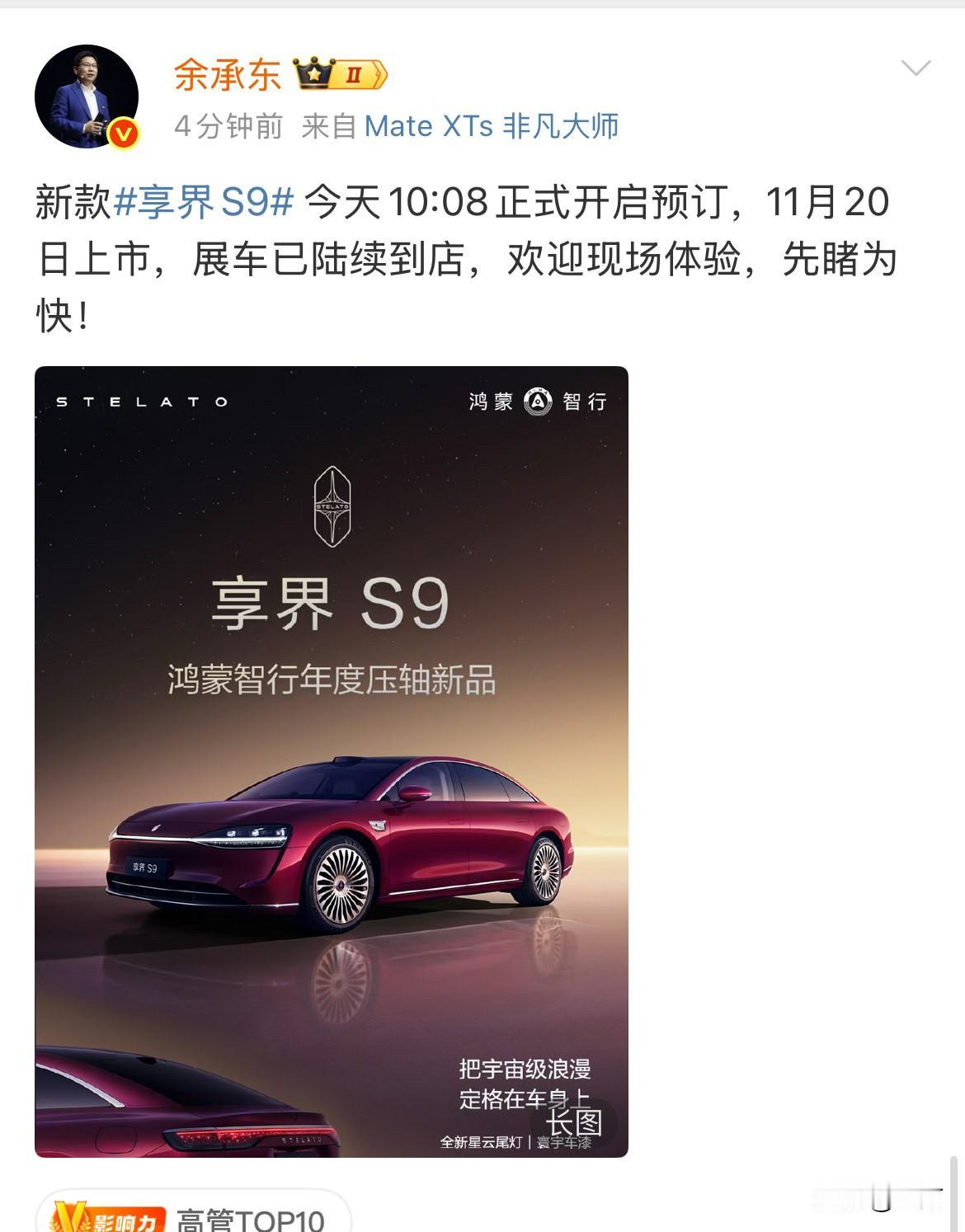余承东:享界S9今天开始定,20号上市! 就在刚才,余承东在个人的社交网络