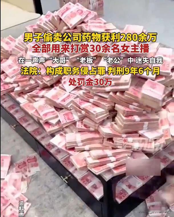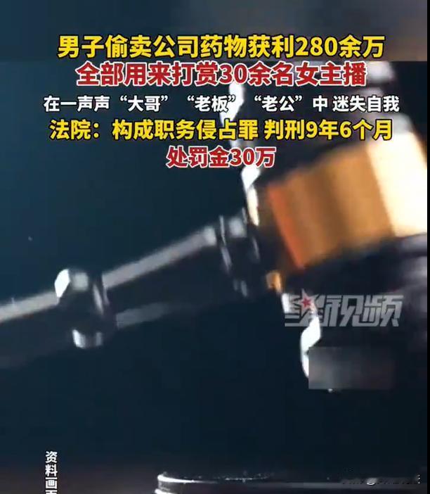“大哥好,谢谢打赏300多万~”,一家医药公司的男销售,沉迷于网络打赏,30多名女主播,甜言蜜语称呼男子为“大哥”“老板”“老公”。男子非常上头,半年就把40万存款全都打赏掉。没钱之后,又想着偷卖公司的药物,利用职务之便,将货品偷偷转卖,非法获利280多元万,然后又全部打赏给女主播们。 star星视频11月6日报道了这则新闻。这就是自尊心作祟的下场,最后,男子因为职务侵占,被判处9年6个月有期徒刑,同时还要被处以罚金。 从去年开始,作为药品公司销售的男子,就沉迷于网络直播,虽然女主播都是美颜、滤镜,但是男子还是很喜欢这些女孩们。 起初刚开始刷直播的时候,男子也只是刷个几十元的礼物,但是奈何这些女主播们,过于甜言蜜语,一个个不仅长相甜美,嘴巴还特别乖巧。 “大哥真棒!”“哎呀,老公啊,谢谢打赏~”“老板好,老板真大气~”,就这样,女主播们一遍又一遍的开始灌迷魂汤,男子被迷得七荤八素。 后来,男子虚荣心不断的膨胀,就大手一挥,几百块钱丢出去了;再后来直接就是几千块丢出去。女主播们也是开心的很,男子也是在一声声称赞中获得了满足。 没过多久,前后也就半年的时间,男子就花光了自己40多万的积蓄。虽然手里没钱了,但是男子还是想着要给那些女主播们打赏。 直到完全没钱了,男子再次出现在直播间的时候,那些女主播看到男子没有给打赏,干脆就不搭理男子了。对此,男子感到自尊心受挫。 “应该去哪里搞钱呢?没钱了,这些女孩子们都不喜欢我了。”面对这样的尴尬局面,男子非常苦恼。 想到自己在公司是做药品销售,于是就利用职务之便,清点仓库药品的时候,以“临时调货”为理由,不断提取货品。等到这批药品到了自己手里之后,男子再以低于市场价的价格销售出去。 就这样,一直到今年,男子在公司的行为可以说是变本加厉,前后非法倒卖公司的药品多达20多次,一共获利280多元万。 钱到手之后,男子就去打赏那些女主播们,没过多久,这280万元,又全都挥霍一空。加上之前的40万存款,男子可谓是花出去320多万。 由此可见,沉迷于网络打赏的这位男子,已经达到了丧心病狂的地步。究竟这些美女主播们怎么可以有如此魔力?还是要清醒为好,网络世界,真假虚实,自己做好分辨比较好。 而这位男子,手里的钱再次清空。公司那边也发现了端倪,调查清楚之后,直接将男子给上诉。最终,男子因为职务侵占罪,被判处9年6个月,并且处以罚金30万元。 1.女主播们甜言蜜语喊“老板”“老公”“大哥”之类,诱惑男子打赏,金额高达320万元,这种情况是否存在诱导打赏呢,是否可以找平台要求退还? 根据《民典法》规定,如果网络主播以虚构恋爱关系承诺汇报的方式,或者使用特定话术如“老公、大哥”等亲密招呼诱导用户进行高额打赏,这些行为可能会被认定为“虚假人设诱骗打赏”,属于违法行为。 作为平台用户,如果打赏金额高达3000元,已经超出立案标准,(本案已达320万),可以联系平台申诉要求退款,或者保留法律诉讼途径,要求对方退还部分或者全部款项。 2.利用职务之便,偷卖公司的药品,这样的行为是否犯法?偷卖金额高达280万,男子将会面临怎样的处罚? 根据《刑法》第二百七十一条规定,公司、企业或者其他单位的人员,利用职务便利将本单位的财物非法占为己有,数额较大的,即构成职务侵占罪,将会面临刑事判刑。 本案中的这位男销售人员,作为公司员工,偷卖公司的药品,并且将公司的财物非法占为己有,涉案金额高达280万元,已经达到了“数额巨大”或者“数额特别巨大”的标准,将会被判处三年以上十年以下有期徒刑,同时还会处以罚金。 作为成年人,面对虚拟的网络世界,应当具备清醒的认知,因为自己的内心私欲就想要作出违法的事情,最后必定会面临法律的严厉制裁。 大家对这位男子的行为都有何想法呢,欢迎一起来讨论吧。