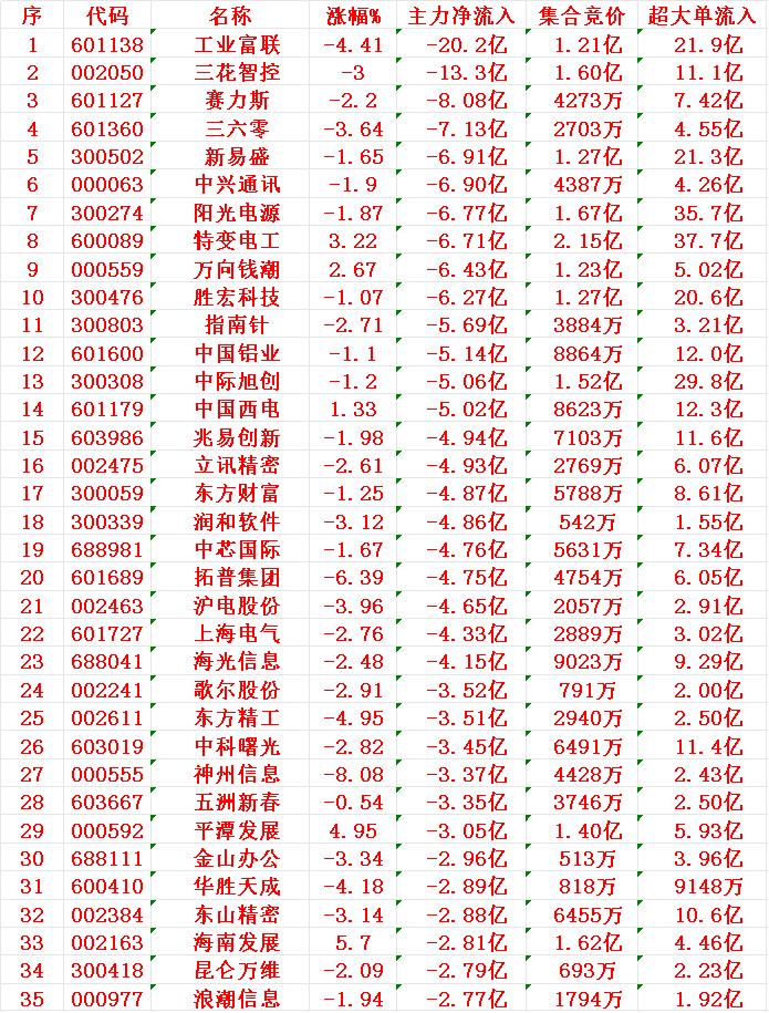 11月7日尾盘30分钟,主力资金大幅卖出的35名单! 工业富联:净流出 20.2亿元,集合竞价成交额 1.21亿元 三花智控:净流出 13.3亿元,集合竞价成交额 1.60亿元 赛力斯:净流出 8.08亿元,集合竞价成交额 4273万元 三六零:净流出 7.13亿元,集合竞价成交额 2703万元 新易盛:净流出 6.91亿元,集合竞价成交额 1.27亿元