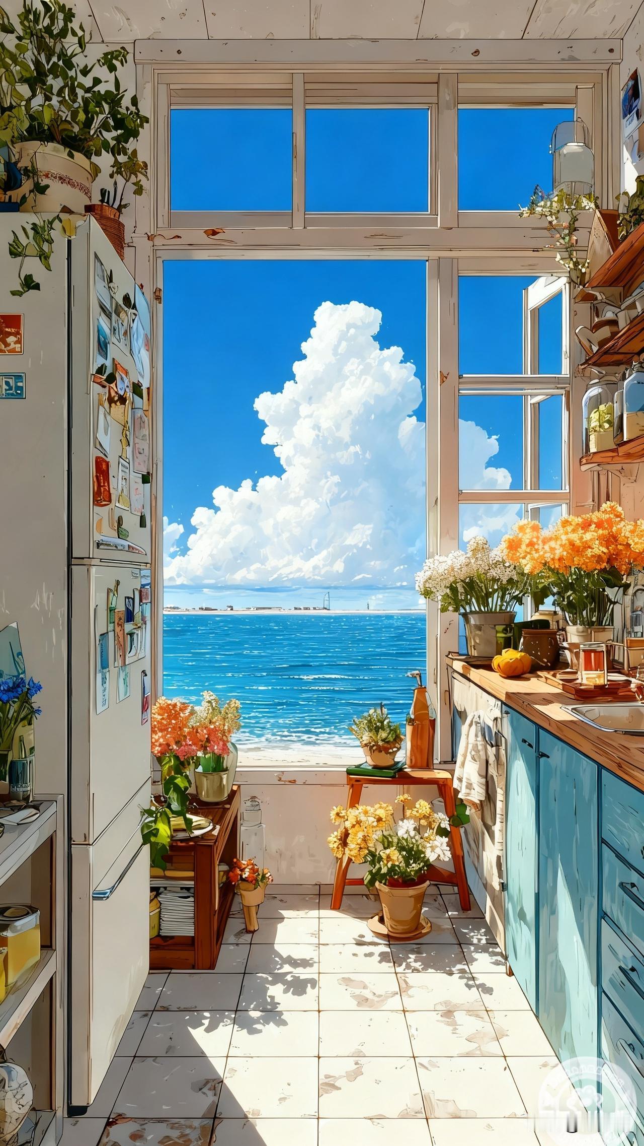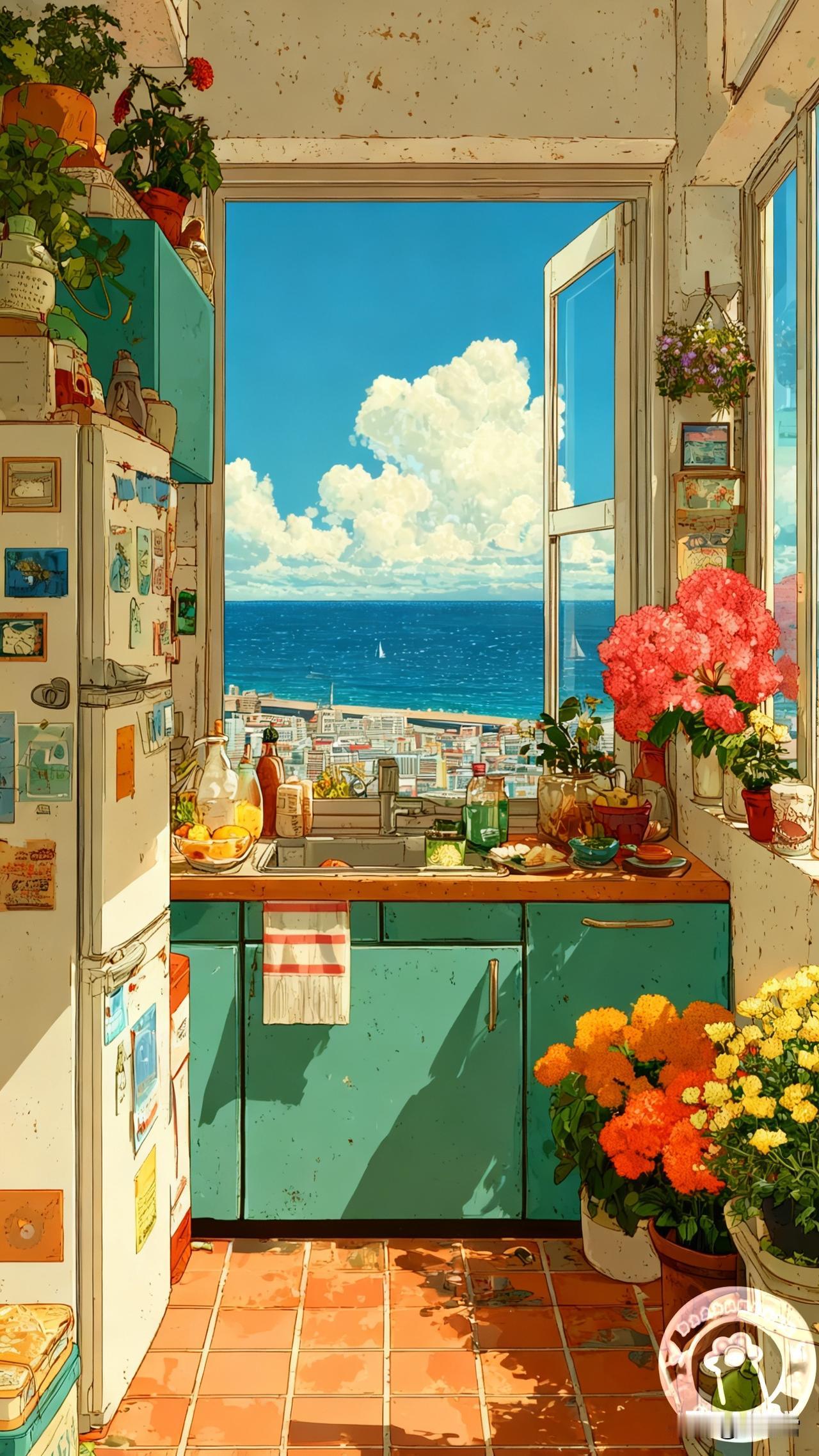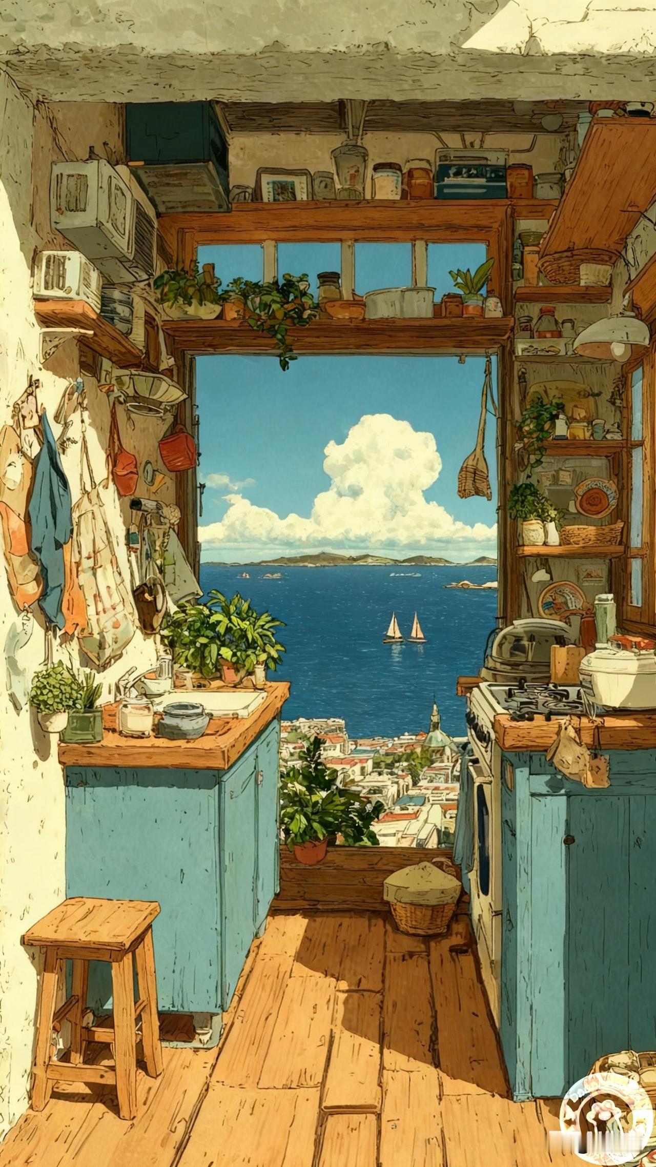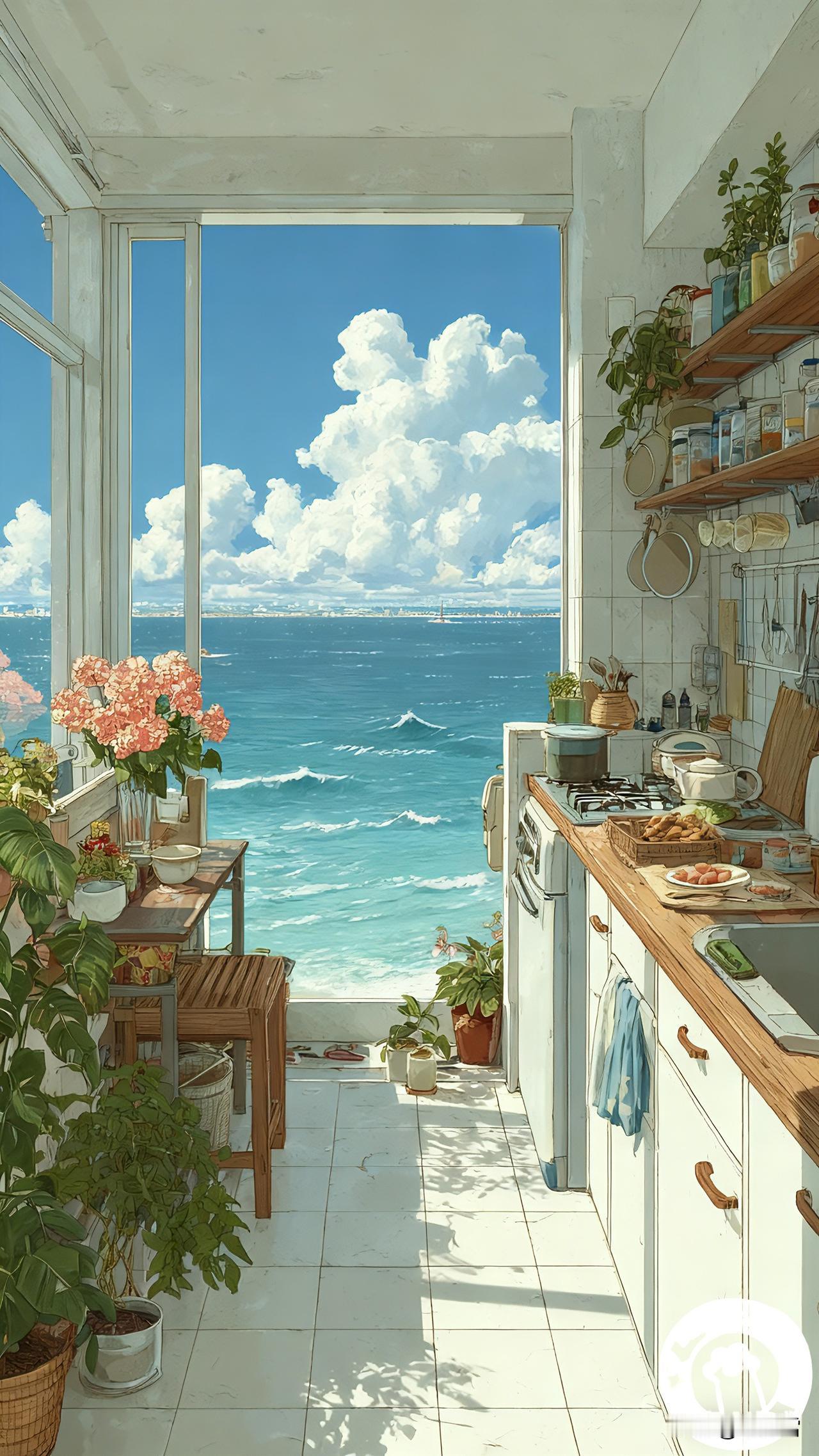 风裹着云朵吹进厨房|壁纸 一推开窗就是蓝到晃眼的海 云朵像刚揉好的棉花糖,软乎乎浮在天上 锅里的汤在咕嘟,窗台的绣球正晒着太阳 连洗碗时溅起的水珠,都裹着咸咸的海风 生活的甜不用找 是橱柜上歪歪扭扭的罐子 是桌角刚开的花 是抬头就撞进眼里的蓝 ——今天的厨房,又攒满了治愈的光✨