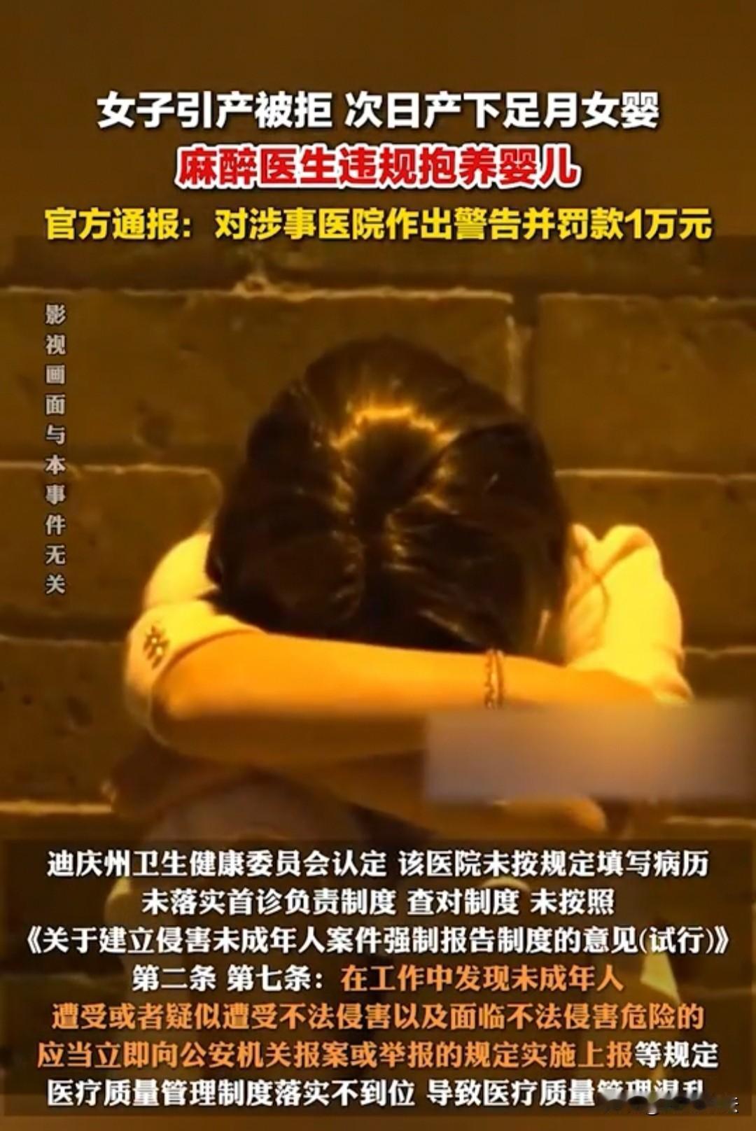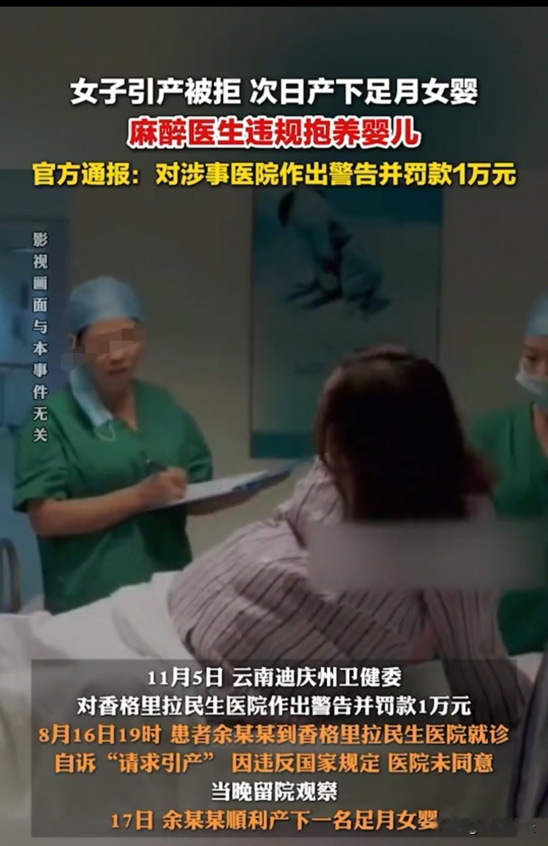 婴儿被私抱领养,云南,余某前往医院引产被拒,次日竟产下足月女婴。因她不想要这个孩子,麻醉医生称有亲戚想收养,便在婴儿被包裹好后直接抱走。隔了一天,余某办理出院,但医院仅留存一张分娩记录,产程记录也只有一份,且余某入院时未被查验身份信息,也没有对应的门诊及住院病历。 8月16日19时,余某挺着大肚子来到医院,要求引产。可医生一看,孩子已经足月,引产是违背法律的,必须留院观察,保障婴儿的正常出生。 余某没有办法,身体又笨重无处可去,只能住院。17日,余某顺利产下一名足月女婴,她明确表示不想要这个孩子,称经济困难,还有其他不便说的原因,反正就是不愿抚养。 这件事传到了永某的耳朵里,她是一位麻醉医生,亲戚一直想要领养一名孩子。 她心想,余某本身不要孩子,把孩子抱给自己亲戚正好,于是便找到余某商量,想把孩子抱给自家亲戚。 余某当然高兴,虽然自己不想要,但孩子终究是心头牵挂,能让本来就想领养孩子的家庭收养,想必会善待孩子,因此就同意了。 所以孩子生产后的第一时间,包裹好后,永某就抱着孩子去找亲戚了。这个过程都是她们私下进行的,并没有走正规程序。 她们觉得一个不要、一个愿意收养,这是两全其美的事情,只要协商好就可以了。 18日下午,余某身体恢复得差不多便出院了,整个过程对她来说还算顺利:顺利生下孩子,孩子又顺利被领养,自己身体也顺利恢复,一切都皆大欢喜。 不过,这个孩子被抱养出去并未走正规程序,后来有人上报了此事。卫健委立即介入调查,发现余某的具体信息未登记在案,这显然不符合规定。 另外,很多过程都没有记录,就连分娩记录都只有一张,产程记录也只有一张,和正规流程完全不符。 接着调查发现,余某的住院病历也缺失,相关部门归咎于医院医疗质量管理混乱,责令其整改。 最后,官方通报,此次收养孩子的行为不符合标准,对涉事医生作出警告并罚款1万元。 不过,网友们觉得这有点蹊跷:为什么孩子都足月了,余某还要求引产?这是不是只是一种说辞? 还有人说,怎么就那么凑巧,永某刚好有亲戚想要领养?这是不是一条龙服务? 还有人觉得,这不应该只是行政处罚,还应该报警处理,这哪是医院管理混乱,分明是有意为之,其中的隐情可能只有她们自己才知道。 1、该事件中,麻醉医生永某将女婴抱给亲戚收养,未走正规的收养登记程序,因此收养关系不成立。 根据《民法典》第一千一百零五条规定,收养应当向县级以上人民政府民政部门登记,收养关系自登记之日起成立。 2、该医院未履行强制报告义务,违反了相关规定。 依据《关于建立侵害未成年人案件强制报告制度的意见(试行)》,密切接触未成年人行业的各类组织及其从业人员,在工作中发现未成年人遭受或者疑似遭受不法侵害以及面临不法侵害危险的,应当立即向公安机关报案或举报。 3、医院未查验患者余某某身份信息,无门诊及住院病历,仅有分娩记录1张、产程经过单1张,违反规定。 依据《医疗机构管理条例》《病历书写基本规范》等规定,属于严重的医疗质量管理混乱。 对于此事,大家如何看待? 素材来源于:纵览新闻2025年11月7日