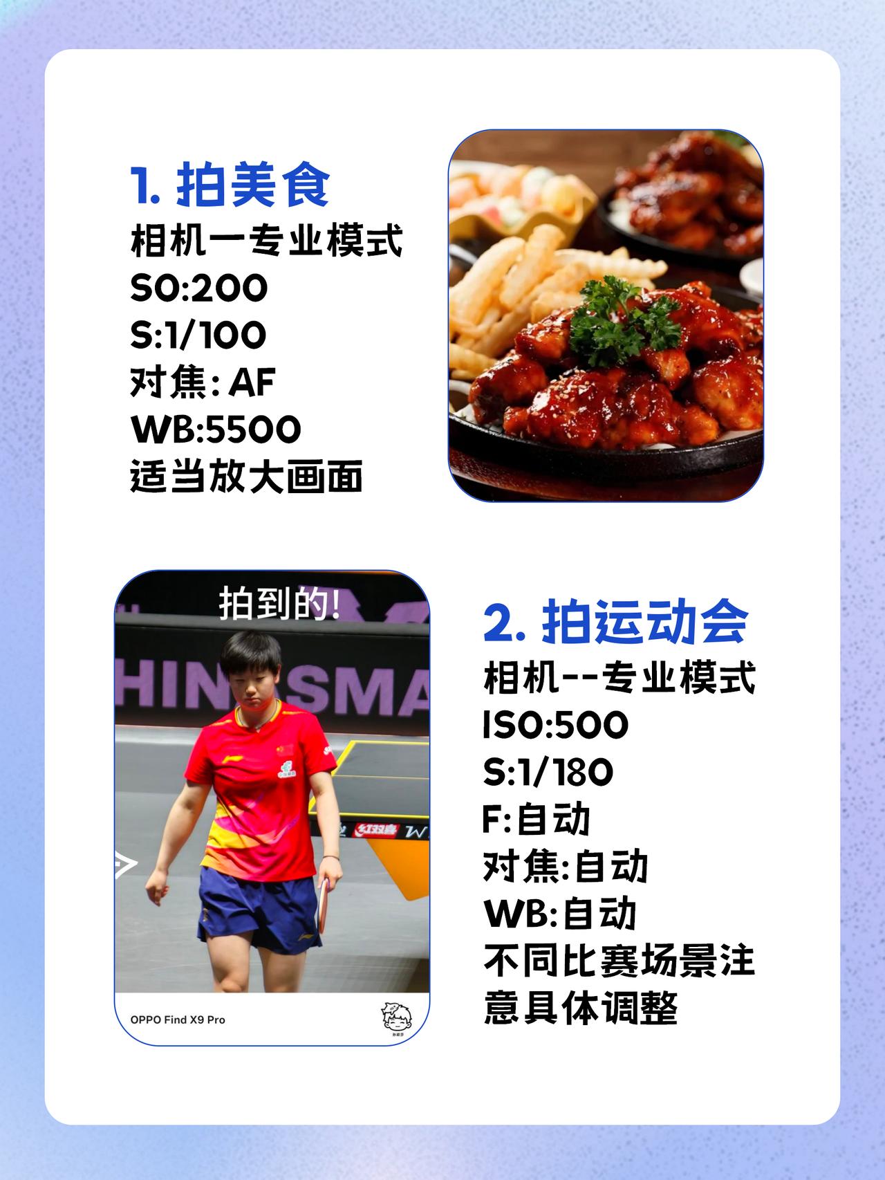 全运会拍不出大片?调对参数OPPO直接变单反 ❌别再说你不会拍照了! 是不是总觉得手机拍照差点意思? 明明景色超美,拍出来却平平无奇? 🤔其实都是因为我们不会构图、不会调参数 今天学会这一篇,就让你把OPPO手机变身单反的小技巧摸得透透的👇 1️⃣拍美食 2️⃣拍运动会 3️⃣拍月亮 4️⃣拍星空 5️⃣拍丁达尔效应 6️⃣拍街景 7️⃣拍蓝天白云 8️⃣拍城市夜景 9️⃣拍演唱会 🔟拍雨滴 最近正拿着莎莎同款📱Find X9 Pro狂练运动会模式 已经抢到票了,马上就要去看全运会啦! 就是位置不太好,只买到看台边角位😭 只能靠哈苏真2亿的潜望长焦了! 画质直接拉满,相信拍运动员特写也会超清楚 而且还有丹霞镜头+哈苏影调加持,色彩、质感都挺不错的 现在还学会了OPPO Find X9 Pro这份参数秘籍 直接手机变单反📷妥妥的观赛神器 再也不怕拍出糊片了👍 PS:相机--专业模式记得这样调⚠️ ✅IS0:500 ✅S:1/180 ✅F:自动 ✅对焦:自动 ✅WB:自动 💡不同比赛场景注意具体调整~ 听说OPPO还办了一个“OPPO全拍会” 据说晒出在全运会记录的超清赛场高光时刻就能参与~ 全运会拍照技巧OPPO手机OPPO Find X9