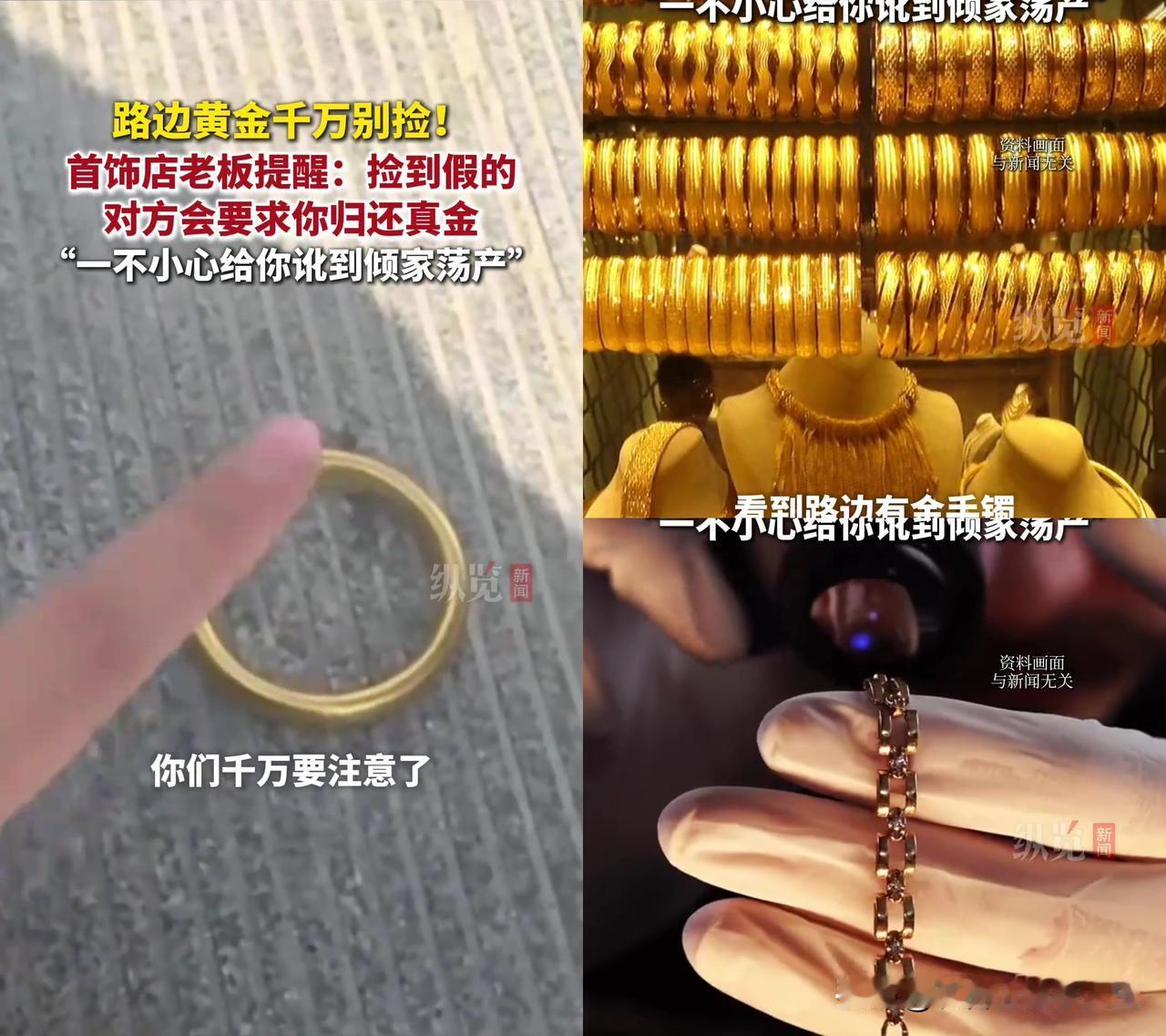昨天店里阿姨哭着跑来找我:“我捡了个金镯子,倒贴2万!” 她早上在菜市场门口,蹲下来捡那亮闪闪的小镯子,刚攥手里,突然冲过来3个男的,拽着她手腕喊:“那是我妈治病的金镯!”还掏张皱巴巴的发票:“4万买的,你得赔!” 阿姨吓得手都抖,赶紧转了2万才脱身,后来一验,镯子是假的,发票也是假的! 有人说:“捡假的凭什么赔?”“谁主张谁举证啊!” 可骗子就吃准了:一群人围上来的时候,你脑子全是“别惹事”,根本没时间想逻辑! 我们并非怕事,这群人是把捡东西变成了坑人的局! 路边的“黄金”真碰不得,并非不让做好事,有些好事里,藏着刀呢! 大家要是遇到这种情况,能冷静说“拿证据证明是你的”吗?