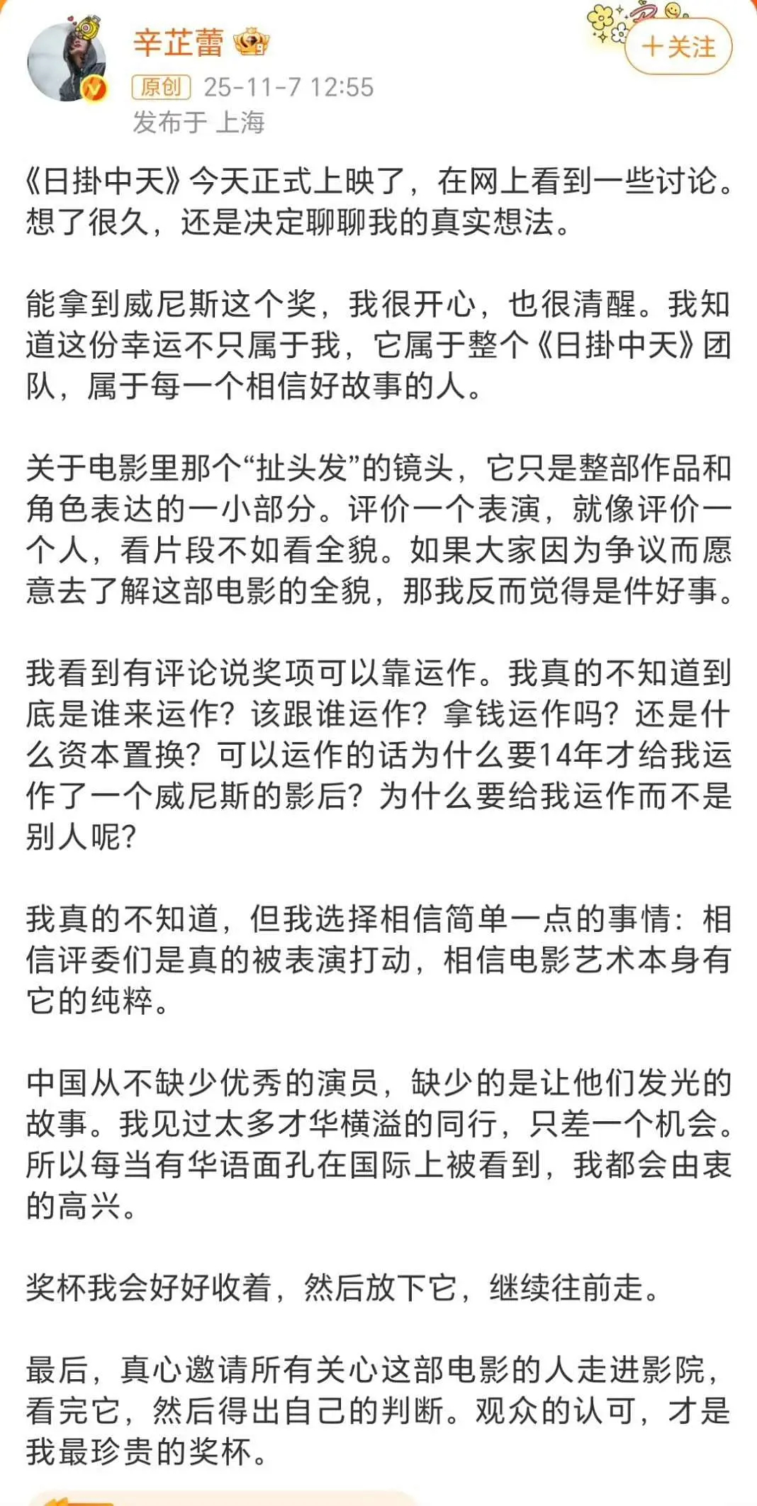 疑似郝蕾朋友圈发文辛芷蕾这个时间站出来发六连问是不是有点太冲动了?本来王传君和辛芷蕾的拿奖毫无可比性,日掛中天不是以女主名字命名大女主电影的挂件男主角,也没传闻的沪圈4️⃣奖职场80传闻,结果郝蕾一下全扫射了,感觉辛芷蕾被王传君给捆绑混为一谈了……辛芷蕾6连问