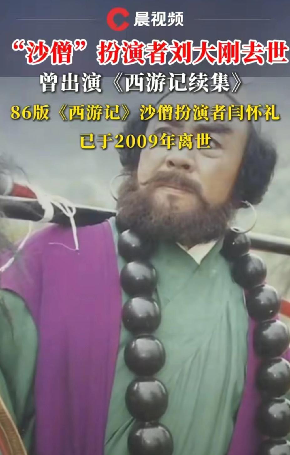 86版《西游记》沙僧续集扮演者刘大刚去世。11月3日,刘大刚在北京病逝,享年79岁。他的子女11月7日发布讣告,声明遵从遗愿,丧事从简。 网友感叹,两届的沙僧全去世了,看来我真的老了。86版的《西游记》第一个沙僧扮演者闫怀礼,于2009年4月12日因间质性肺病,导致呼吸衰竭离世,享年73岁。 而刘大刚前几天刚刚去世,具体病因没有公开。目前八六版《西游记》中已经至少有21位演员去世了。 刘大刚是国家一级演员。早年深耕京剧舞台,几十年专攻花脸。1998年,他临危受命,在《西游记》续集里接替闫怀礼饰演沙僧。 为了还原角色。他在道具里塞砖头练习负重感,拍摄打斗戏时被威亚勒的腰间青紫。但是他没有抱怨,仍然坚持拍摄。 刘大刚塑造的沙僧广受好评。两位沙僧的去世引发网友的感慨和追思。甚至有不少网友重温剧情,以这种方式诠释对老艺术家的怀念。曾经六小龄童就评价刘大刚是一个憨厚、热心肠的人,非常善良。