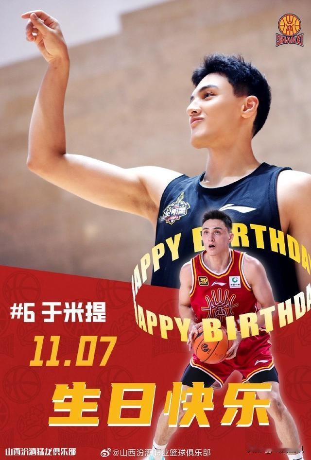 山西汾酒男篮以球队年轻化为主旋律赌明天!今年夏天,山西汾酒男篮最重要的本土引援就是于米提!他是山西汾酒男篮用张文杰的两年租借和内线吕加辉以及部分现金换来的。说白了,山西汾酒男篮就是以非常大的代价在赌山西汾酒男篮明天的振兴!这一押注,可以说是押了10年的签。为此,在于米提今天满21岁时,山西汾酒男篮对他送上了最真诚的生日祝福!上赛季,于米提代表广州男篮出战44场,场均出场26.4分钟,得到7.3分2.7篮板1.4助攻,投篮命中率37.2%,三分32.2%,罚球86.5%。别忘了说一声:于米提生日快乐!