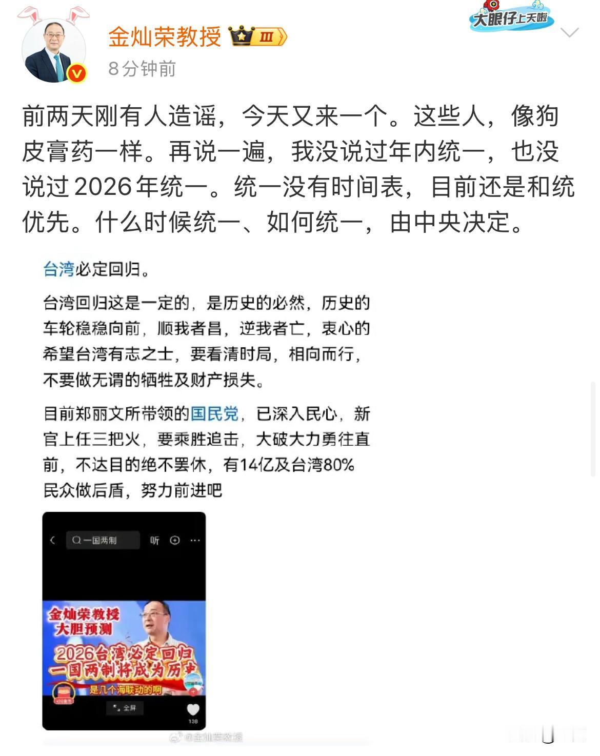 金灿荣教授生气的说:我没有说过年内统一! 今天晚上,本来沉浸在航空母舰的幸福和