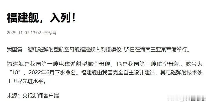 福建舰服役了!性能究竟有多先进?更强大航母已在路上! 据新华社7日消息,我国首艘电磁弹射型航母福建舰于5日在海南三亚某军港盛大举行服役仪式,正式成为中国海军一员。仪式现场,数千人齐聚,福建舰满旗招展,如巨龙傲立海上。 服役后的福建舰归属南部战区,以三亚某海军基地为“家”,将成为守护南海等周边海域权益的中流砥柱。作为我国首艘直通甲板航母,更是全球常规动力电磁弹射航母的“独苗”,它的服役让中国海军远海作战能力实现质的飞跃,具有划时代意义。 回溯历程,2022年6月17日福建舰下水,随后历经舾装、系留试验等环节。2024年5月1日,它首次驶向大海进行测试。截至2025年9月,已完成9次海试,动力、电力等关键子系统均经全面检验。9月,福建舰首次南下穿越台湾海峡进入南海,国防部表示其赴南海是为继续科研试验与训练,还透露已完成固定翼舰载机起降试验,歼 - 15T、歼 - 35、空警 - 600的起降画面震撼公开。 国防部证实,福建舰电磁弹射阻拦系统性能卓越,成功实现三款舰载机的弹射起飞与降落,技术上领先美国福特号,实现重大突破。军事专家称,福建舰在动力、电磁弹射、舰载机领域均达世界顶尖水平,作战能力与美国现役航母相比毫不逊色,甚至可与福特号一较高下。 福建舰排水量超8万吨,虽采用常规动力,但配备的中压直流综合电力系统极为先进,效率与功率密度双高,能智能调配电力,充分满足电磁弹射及全舰作战的电力需求。 值得一提的是,中国突破电磁弹射技术后,美国特朗普曾妄言其“故障频发”,欲回归蒸汽弹射。然而,电磁弹射具有重量轻、体积小、起降效率高、无故障周期长、可兼容无人机、维护需求低等显著优势,对航母作战能力的提升是全方位的。 福建舰服役并非终点,中国新一代核动力超级航母已在紧锣密鼓建造中,其作战能力将全方位超越福特级。新航母的问世,必将极大提升中国保家卫国的能力,为维护世界和平稳定注入强大动力。