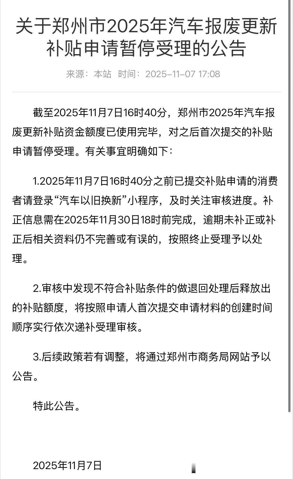 郑州的报废补贴已经停止,但是郑州报废补贴停止有些太仓促了。早上8点发文还有4200万,下午5点08发文说已经结束了。而且2025年11月7日16时40分以后的申请,将不再受理。这也即意味着你今天开发票、今天新车上牌,但是旧车报废手续没拿到的。或者旧车手续拿到,今天新车开票但是没上牌的,或者在16时40分以后上传的,都已经拿不到了。 我相信肯定有在结束之前没有上传完成的,而且现在有些地区依然采用这种方式。大家一定要看清楚政策,否则真的可能造成新车已经买了、旧车已经报废,但是拿不到报废补贴的情况。