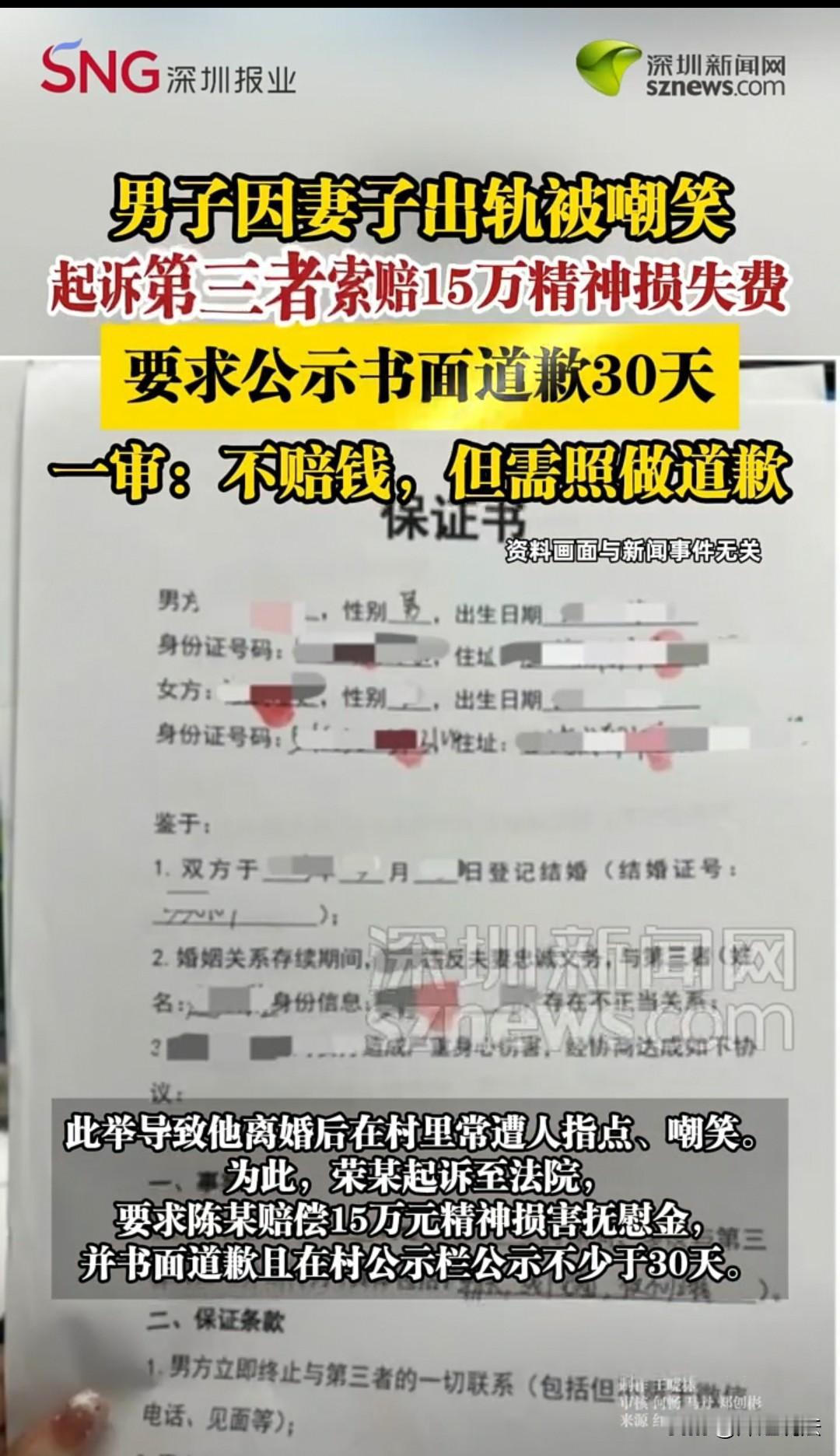 廊坊,男子起诉了妻子的出轨对象,结果妻子跟他离了婚,最后他还成了村民们的笑话。他觉得这一切都是那个人的错,于是又把对方起诉到法院,要求对方在村里的公示栏赔礼道歉30天,还要赔偿自己15万。 男子最近特别苦闷,一出门就觉得有人在背后指指点点,还发出异样的笑声。 这些异样的眼光和议论,都源于他起诉了妻子的出轨对象陈某。他都不知道陈某什么时候和自己妻子走到一起的,这事儿让他心里堵得慌。 他警告过妻子和陈某后,两人倒是收敛了不少,但还是偷偷摸摸来往。 男子实在咽不下这口气,直接起诉了陈某,要求对方写保证书,再也不能和自己妻子联系,不然他就会做出过激举动。 陈某也怕了,赶紧赔礼道歉,承认了和他妻子的关系,还写下保证书,说以后再也不往来。 可这么一来,妻子在村里彻底抬不起头,总有人在背后说三道四,让她羞愧难当。 妻子觉得,与其这样受委屈,不如干脆和丈夫离婚,换个地方生活,也比在村里被人戳脊梁骨强。 男子本来以为把陈某赶走,妻子就会好好和自己过日子,没想到自己这一举动,反而彻底搞僵了和妻子的关系,最后真的离了婚。 村民们这下更有谈资了,之前还能说他妻子,现在妻子走了,就把矛头对准了他,每天三五成群聚在一起,议论纷纷。 只要他一靠近,大家就赶紧住口,这让他更确定,大家就是在嘲笑他、说他的坏话。 他觉得这一切都是陈某造成的:当初如果不是陈某明知他妻子有家庭,还非要凑在一起,自己也不会落到被全村人嘲笑的地步。 于是他再次起诉陈某,要求对方在村里的公示栏赔礼道歉,至少30天,还得赔偿15万元。 可陈某却说,大家都是成年人,谁背后没人议论几句?村民要说他,自己确实有一定责任,但该赔的礼已经赔了,该写的保证书也写了,而且自己一直遵守承诺,根本没再联系他前妻,现在自己没什么错。 一边坚持要赔钱,一边坚决不赔,双方僵持不下。 所以最终判决:陈某只需在村里的公示栏进行30天的赔礼道歉,驳回了男子要求赔偿15万的诉求。 这也是因为,虽然陈某的行为在一定程度上侵犯了男子的权益,但在陈某已经赔礼道歉并遵守不再与男子妻子往来的承诺后,其行为已不再违背公序良俗,对于此后男子所遭受的村民议论等困扰,不应再由陈某承担赔偿责任。 根据《民法典》第一千一百六十五条规定,行为人因过错侵害他人民事权益造成损害的,应当承担侵权责任,但侵权行为与损害后果之间需存在直接因果关系,且行为人主观上存在过错。 在本案中,陈某后续的行为已不存在过错,所以法院不支持男子的赔偿诉求。 对于此事,大家如何看待呢? 素材来源于:深圳新闻网2025年11月7