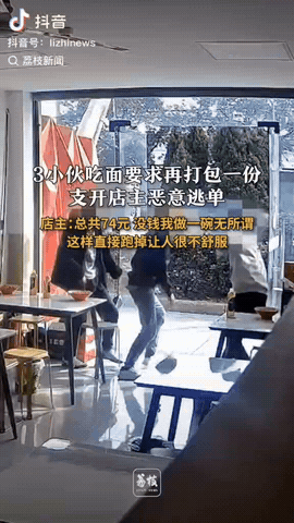 浙江宁波,一店主称三个小伙子来她店里吃面,还要求打包一份,结果就在老板娘进去煮面的时候他们就马上起身逃单了。事后店主表示:他们这样的逃单行为让人很不舒服。 信息来源:荔枝新闻 这三人先吃了三碗青椒肉丝面、三瓶水,接着又要打包一份辣子鸡面,老板娘刚进厨房搅面条,他们就在门口悄悄对视一下,像是事先演练好的一样,动作利落地一扫而空。 等老板娘捧着打包面出来,才发现门口早空无一人。 监控里全程录了个明明白白,小伙们配合得可默契了。 老板娘心里不是因为丢了七十四块钱,而是被这一出“吃霸王餐”的把戏给气得不行。 她说要是他们真没钱,哪怕一声直说,免费给吃一碗都行,可这骗吃骗喝的感觉比钱更扎心。 她把视频一发,想提醒同行以后碰到这事儿别手软,也别光抱怨,要留证据、报警处理,否则小本经营的老板们说不定哪天就被逼到山沟里去。 网上也炸了锅,有人笑称这是“三十六计·丢人计”,有人替老板娘叫屈:“咱们小生意本来就不容易,伤心的是被人耍得团团转!” 更有人提议,这种明抢不成还跑路的,不但要付钱,还可能面临行政拘留、罚款,别小看这七十四块,说不定就要被治安处罚几天,让你真尝尝“跑不掉”的滋味。 其实,三个小伙子真的没必要做损人不利己的事情,总共就74块钱逃单,他们的名声从此就毁了。 现在都是法治社会,店面到处都有监控,不要贪小便宜,到时候面临的不是付面钱,而是处罚,这样的做法得不偿失。 希望大家引以为戒,不要吃“霸王餐”,往往免费的才是最贵的,每个老板做生意也不容易,如果真有困难可以和老板说说也无妨,也许她会免费请吃饭。