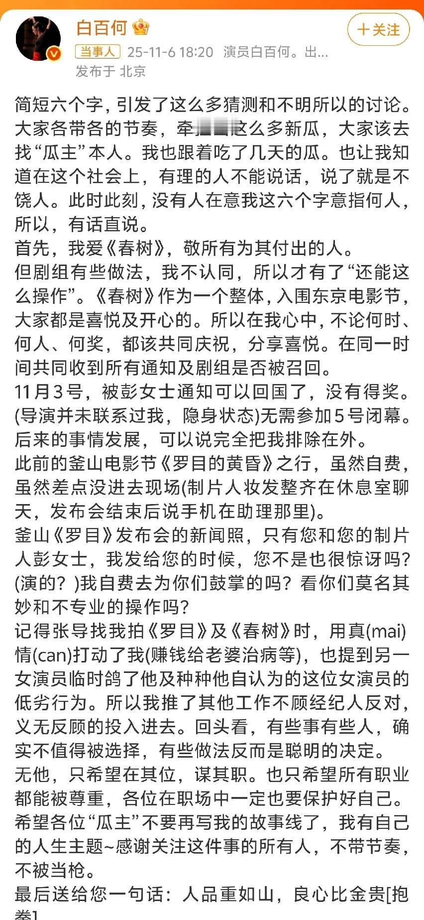 白百何自掏腰包帮剧组冲奖,结果连合影都没她的位置。 《春树》拿东京影帝,颁奖礼上她被通知“没得奖”,人没去,奖却给了别人。 她推掉别的活儿,为的是导演一句“老婆看病急需钱”,结果人红了,她成了背景板。 不是不给名分,是压根没把你当人。 拍片时你是主力,获奖时你是可删的素材。 娱乐圈不缺演员,缺的是把演员当人的制片人。 她没哭穷,没骂人,只是说了句实话: “我拼了命,你们连个镜头都舍不得留。 ” 这话一出,多少人心里咯噔一下? 不是她太计较,是这行太惯着忘恩的人。