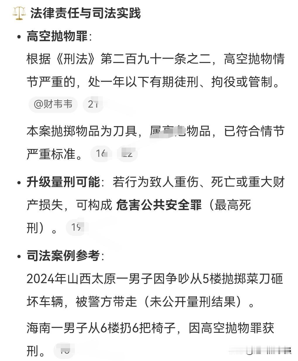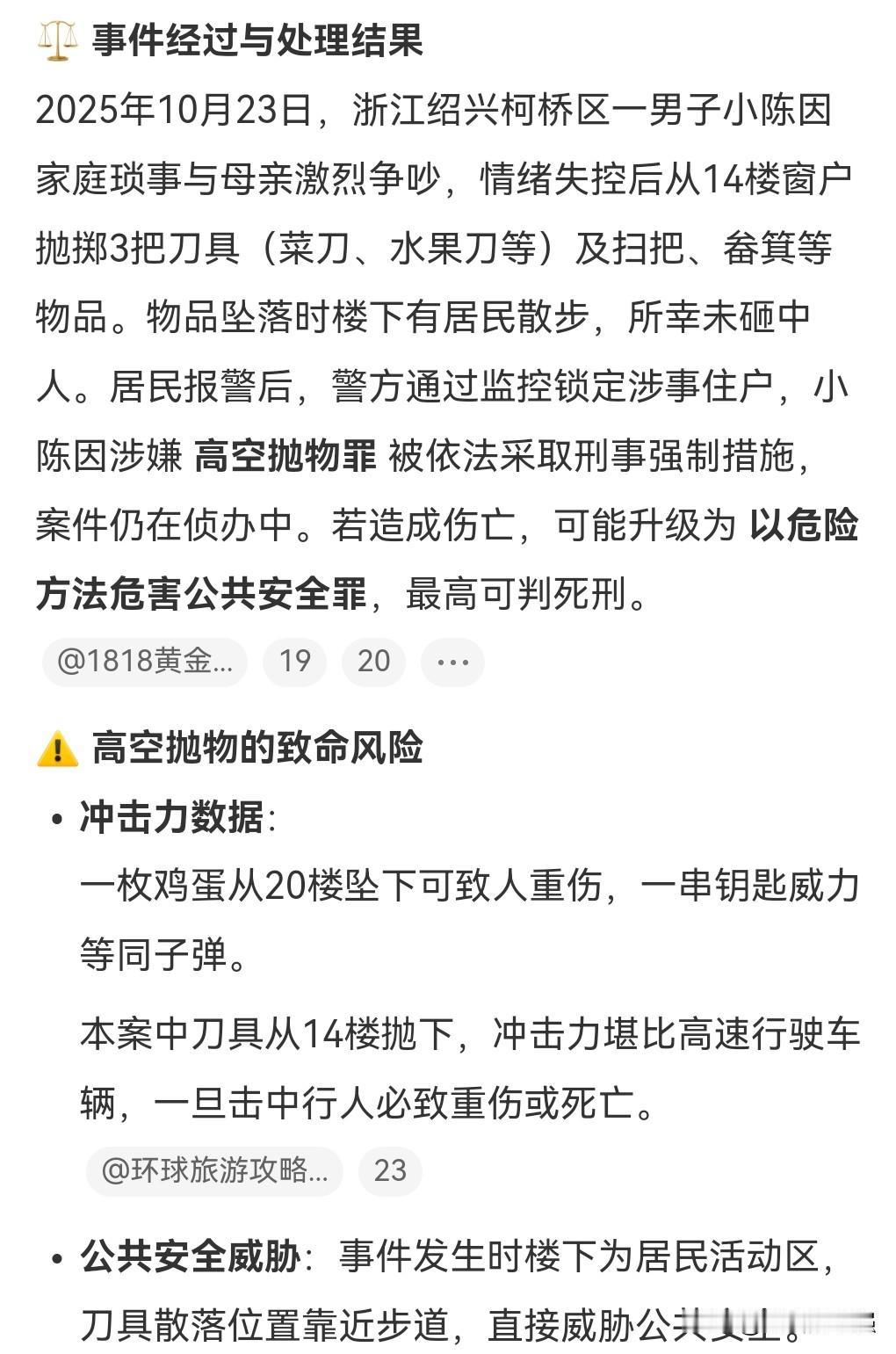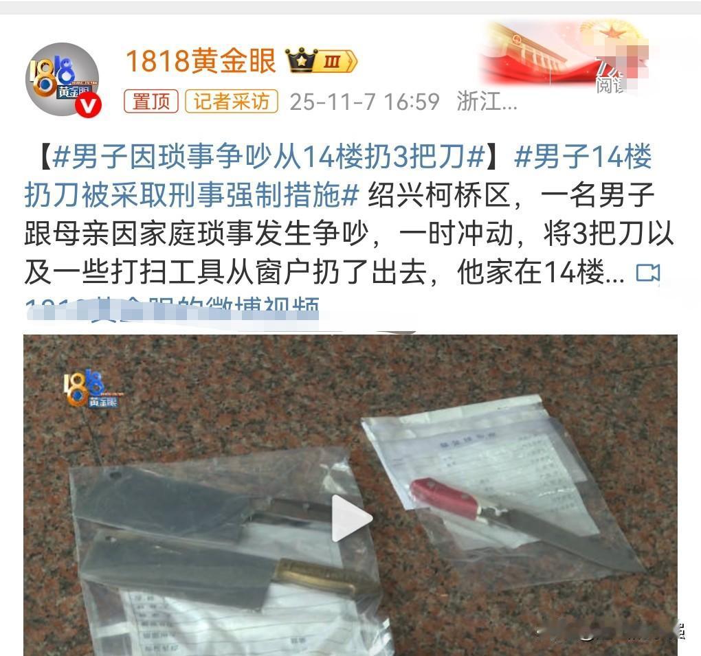 这真的是太冲动了,竟然敢高空抛物,别说砸到人,就算没砸到人,这样的行为都是要受到处理的。 10月23日,浙江绍兴,男子因琐事和母亲发生争吵,从14楼扔3把刀。 这真的是太恶劣了,这要是砸到人,那必定会造成人员的伤亡。 幸亏没砸到人。 但他这样的行为必须接受制裁。