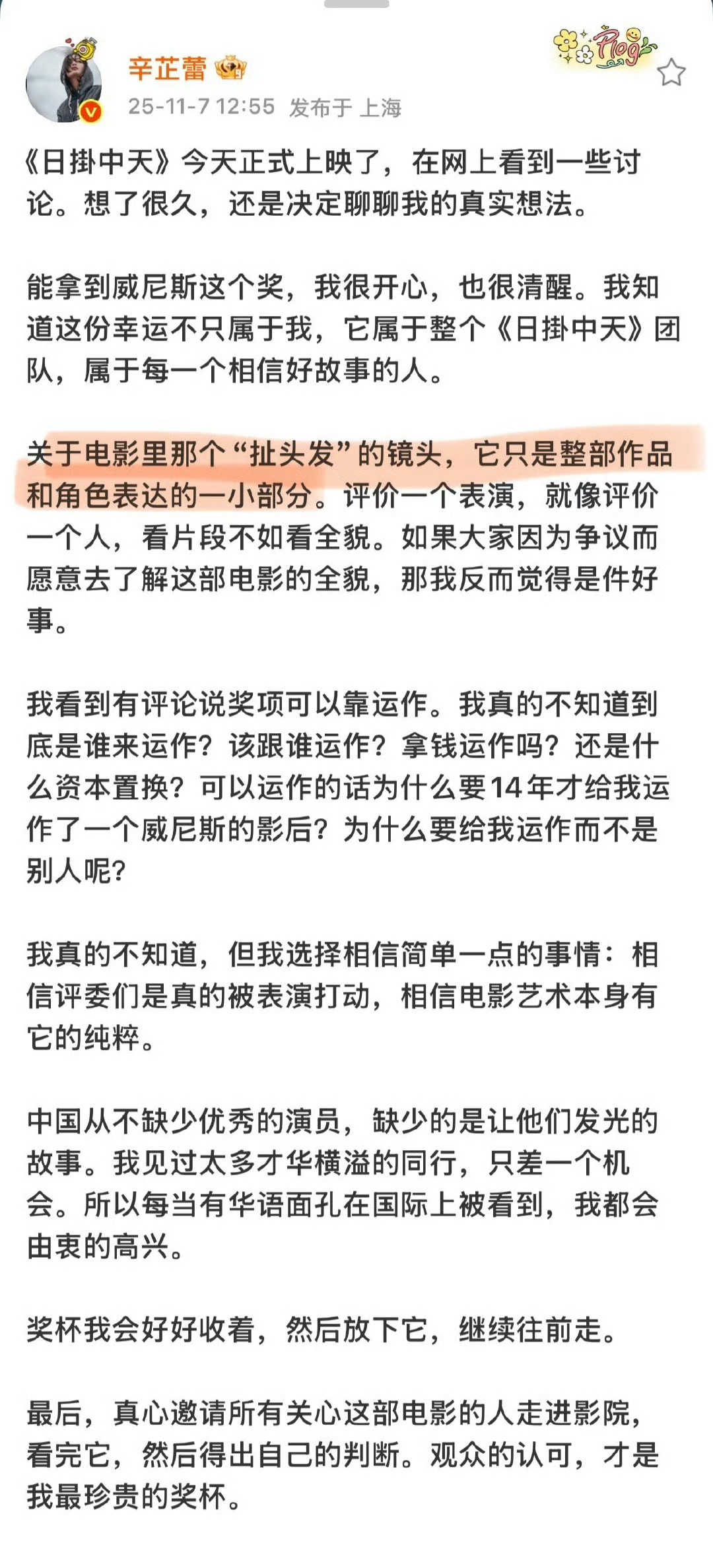 辛芷蕾回应被说靠扯头发拿影后辛芷蕾对影后争议的回应,撕开了行业评价的双重标准。有人紧盯“扯头发”片段质疑含金量,却忽视她在《日挂中天》中细腻且具张力的完整表演,以及国际评委的专业认可。她的反问不仅驳斥了“资本运作”的猜测,更道出华语演员的突围不易。当华语面孔站上国际舞台,我们更该珍惜这份荣光,用全面视角看待表演,而非被片面言论带偏节奏。