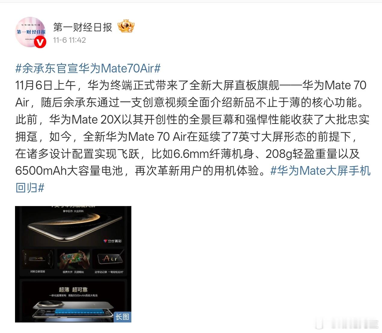 第一财经盛赞华为Mate 70 Air,在诸多设计配置实现飞跃,再次革新用户的用机体验。