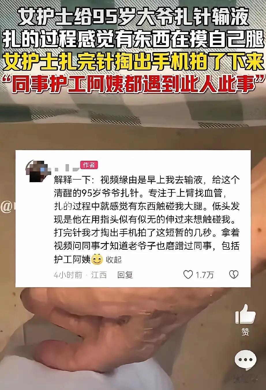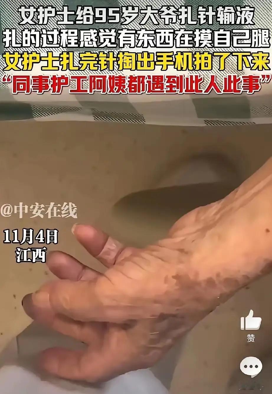 江西某医院,女护士在给94岁大爷输液时,隐约感觉有异物在触碰自己的大腿,女子马上掏出手机,拍下了图片里的一幕。 女护士拿着拍下的视频给同事观看,才意外得知,同事也被大爷揩油过,更有甚者,护工阿姨也曾遭受过大爷的咸猪手。 护士小周(化名)握着输液针的手顿了一下,指尖的凉意顺着手臂往上窜。当时病房里只有她和大爷两人,输液管里的液体正匀速滴落,大爷躺在病床上,眼睛半睁着,手却悄悄从被子里伸出来,在她大腿上蹭了一下。一开始她以为是老人无意识的动作,毕竟94岁高龄,可能手脚不受控制,可那触碰带着明显的刻意,一下接一下,让她浑身不自在。 她强压着心里的不适,快速完成输液操作,转身走出病房时,后背已经沁出了薄汗。犹豫了半天,她还是把手机里的照片发给了同科室的护士小李,没想到小李秒回:“我上次给他测血压时也遇到过,他手直接往我腰上摸!”两人一碰头,才发现科室里还有三位同事都有类似遭遇,有的是换药时被拽住手腕不放,有的是整理床单位时被摸后背。 最让人心酸的是护工陈阿姨,她已经在医院做了八年护工,照顾过不少高龄老人,却唯独对这位大爷犯怵。“有次我喂他吃饭,他突然伸手抓我的头发,还往我脸上凑。”陈阿姨揉着自己被拽过的手腕,眼里满是委屈,“我不敢反抗,怕伤到他,只能忍着,可心里堵得慌。”她们不是没想过告诉护士长,但又怕别人说“老人年纪大了,何必计较”,更怕影响自己的工作,只能默默忍下来。 护士长得知情况后,第一时间找小周等人了解细节,又调看了病房走廊的监控。监控画面里,老人多次在医护人员靠近时,做出伸手触碰、拉扯衣物的动作,虽然幅度不大,但意图明显。护士长没有直接批评老人,而是先联系了他的家属。家属赶来医院后,满脸愧疚地向医护人员道歉:“都怪我们没照顾好老人,他半年前得了阿尔茨海默病,有时候意识不清,还会做出一些奇怪的动作,我们在家也经常被他‘骚扰’。” 原来,老人并非故意为之,而是疾病导致认知功能衰退,情绪和行为不受控制。但这并不意味着医护人员和护工的权益可以被忽视。医院很快制定了针对性措施:安排专人在老人输液、换药时陪同,避免单独接触;给老人佩戴约束带(在家属同意且不影响健康的前提下),防止他随意伸手;同时联系康复科医生,为老人制定认知训练方案,缓解症状。 这件事在医院内部引发了热议。有护士说:“我们理解老人患病的情况,但也希望得到尊重,毕竟谁都不想被这样对待。”也有医生表示,阿尔茨海默病患者的行为异常需要被包容,但更需要专业的干预和管理,不能让护理人员独自承担压力。事实上,这类情况在养老机构和医院并不少见,据中国老龄科研中心的数据显示,我国阿尔茨海默病患者已超1500万,其中约30%会出现行为异常,包括肢体触碰、辱骂等,给护理人员带来了不小的困扰。 护理行业本就辛苦,医护人员和护工每天要面对高强度的工作,还要承受身心压力。尊重他们的劳动,保护他们的权益,是社会应有的底线。对于患病老人,我们需要给予更多的理解和关爱,但这种关爱不能建立在牺牲他人权益的基础上。医院建立完善的防护机制,家属积极配合干预治疗,社会给予更多的支持和包容,才能让护理人员安心工作,也能让患病老人得到更好的照顾。 尊老爱幼是传统美德,但美德的前提是相互尊重。无论是高龄老人还是护理人员,都有被善待的权利。希望这件事能让更多人关注到阿尔茨海默病患者的护理难题,也能让大家明白,包容不等于纵容,尊重不分年龄、不分职业。 各位读者你们怎么看?欢迎在评论区讨论。