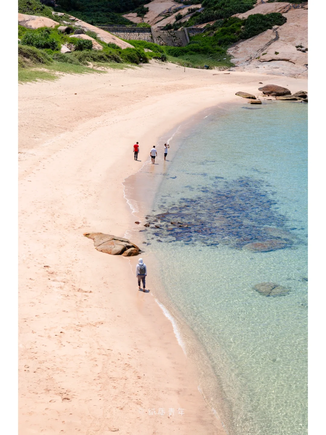 2️⃣穿过庙湾村沿着小路上去可以看到整个庙湾村以及清澈见底的沙滩🏖,再往前走有一个三叉路口🛤,一条上山的路和一条去沙滩的路。往沙滩的路比较陡峭,都是台阶,从这俯瞰沙滩的视角非常不错🌊。