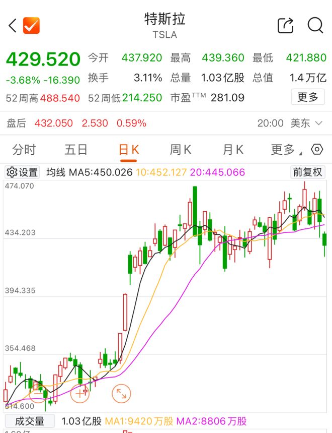 截至11月7日收盘,特斯拉每股报429.52美元,跌幅为3.68%,市值为1.4万亿美元。