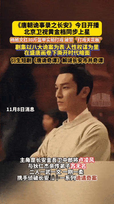 11月8日,古装悬疑剧《唐朝诡事录之长安》登陆北京卫视与爱奇艺。杨旭文、杨志刚领