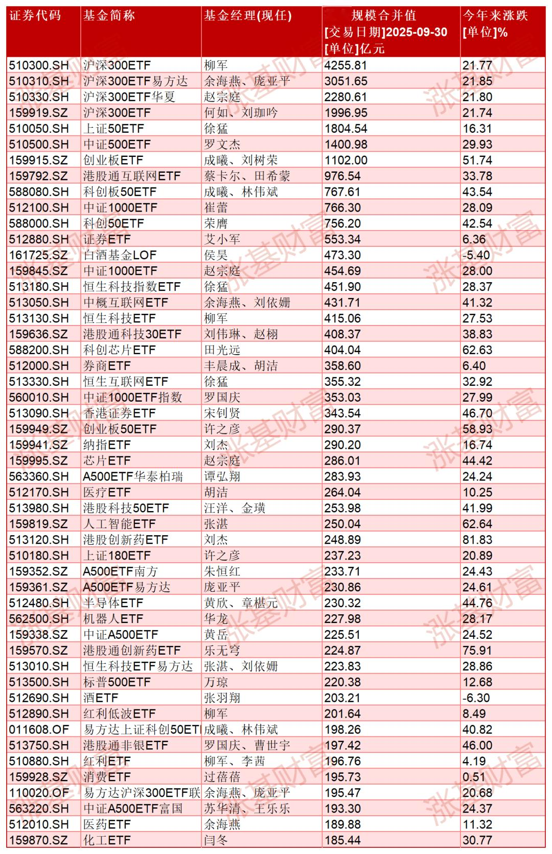 规模位居前四的ETF全都是沪深300ETF,截至三季度末最高的规模超过了4255亿,仅仅前四大沪深300ETF规模就超过了万亿。