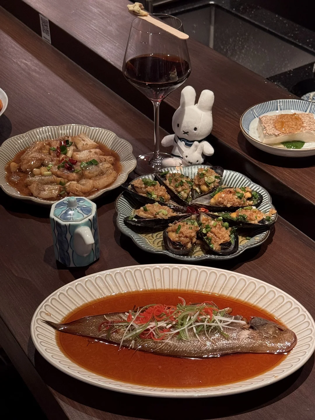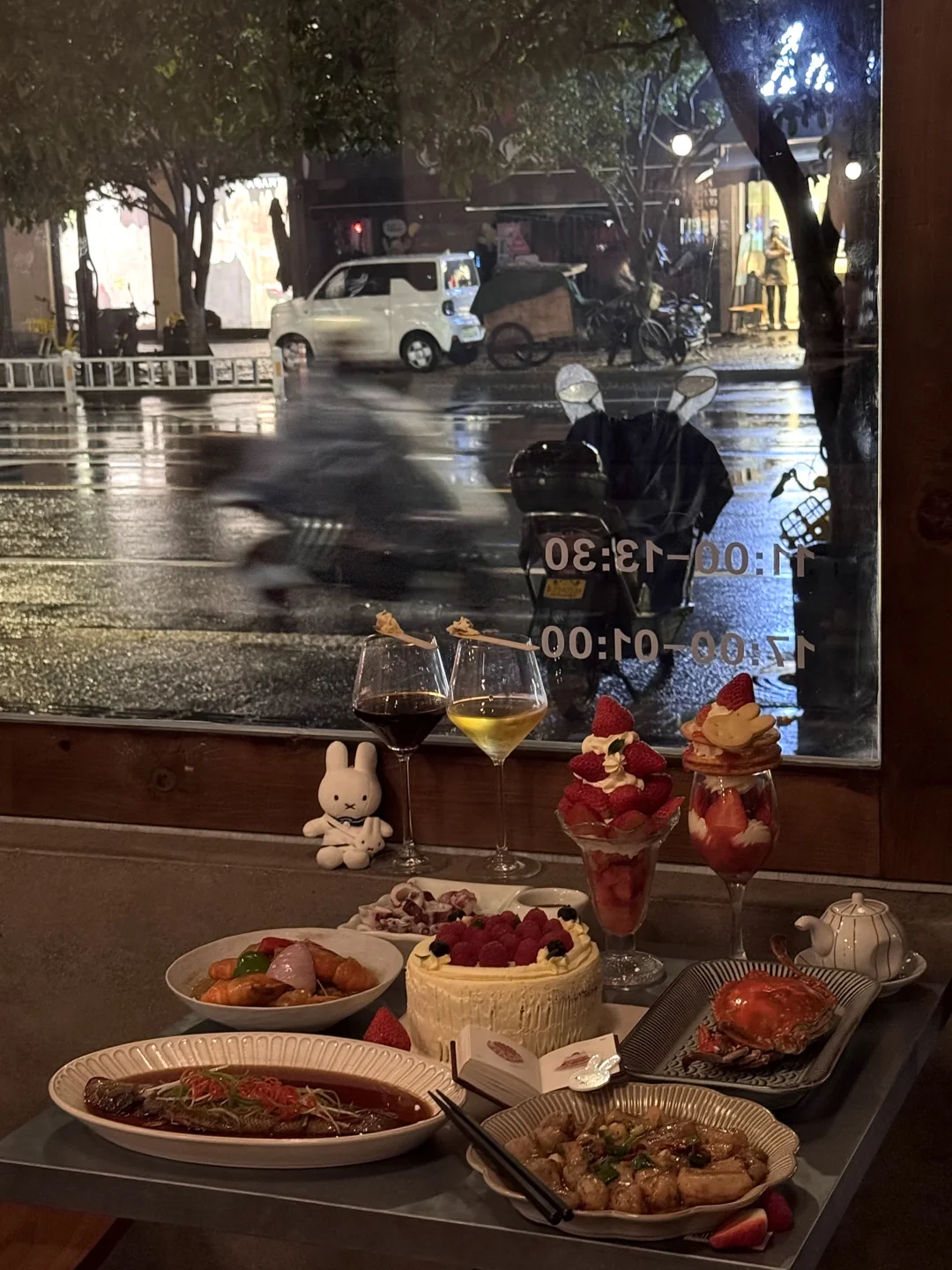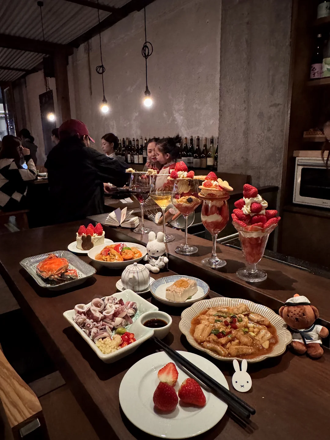 草莓夜芭菲!!亲测好看又好吃!海盐饼干+酸奶油+草莓果酱+草莓果肉+米菲软曲奇!!一口下去惊为天人的好吃。。 白切笔管鱿鱼、蒜蓉贻贝、咖喱罗氏虾🦐随便点点都好吃!每个角落拍照都很出片,不管是约会还是分手都很合适!