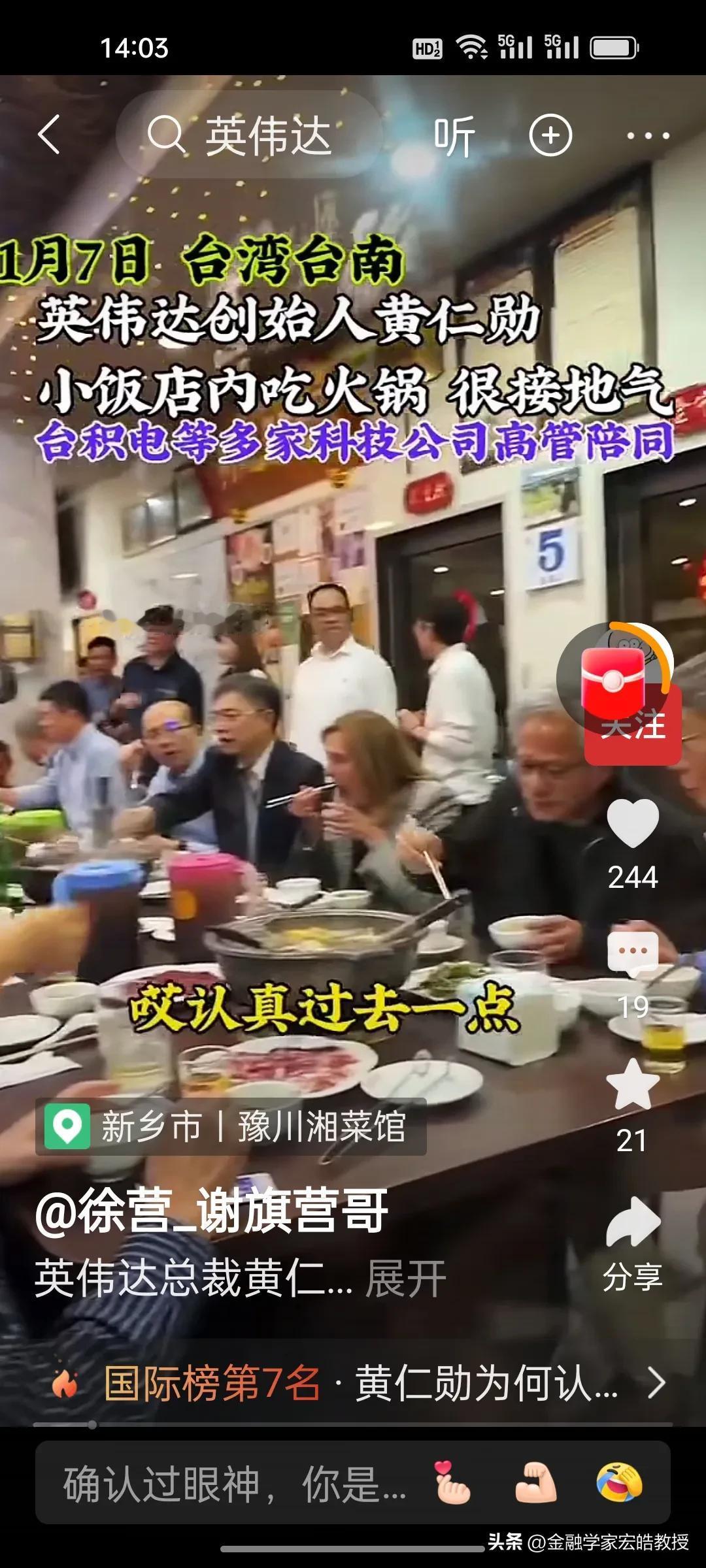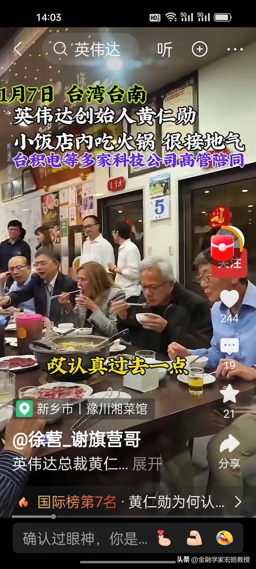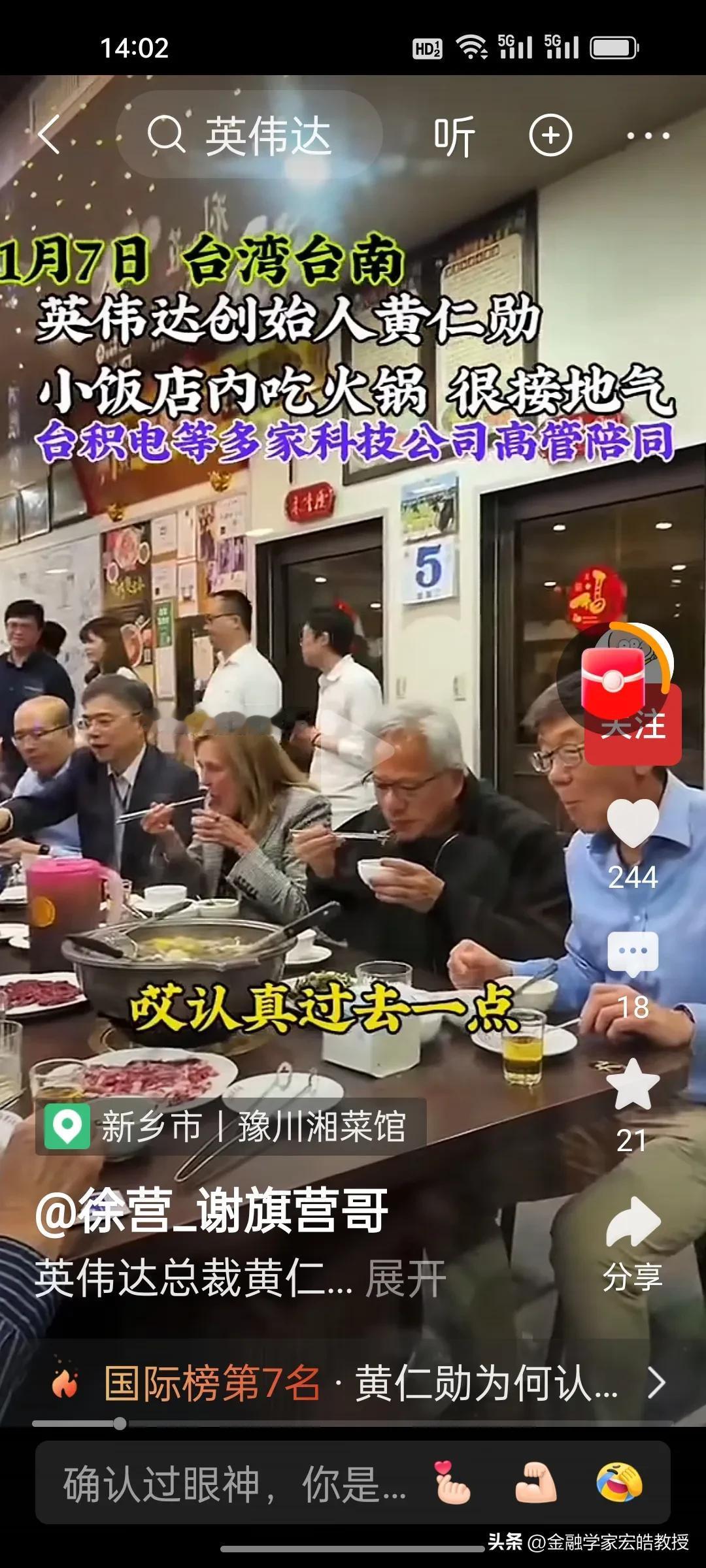 身价1.28万亿人民币,全球华人首富黄仁勋又来台湾吃火锅了! 黄仁勋去年在越南河内跟总理吃街边大排档猪杂汤,前不久在韩国不知名的炸鸡店跟李在镕吃炸鸡啤酒,令人没想到的是韩国炸鸡板块股票大涨,昨天又在台湾台南一家装修普通的火锅店在大长桌上吃火锅,就是很普通的菜和涮肉,他还吃得津津有味。 黄仁勋坐在长桌的最靠边的位置,也不在乎什么C位。黄仁勋真的是不喜欢在包间里吃鱼翅鲍鱼这些奢侈佳肴,就喜欢这些“苍蝇小馆”大厅里的朴实的烟火气,随行一起吃火锅的还有台积电等多家科技公司的高管。