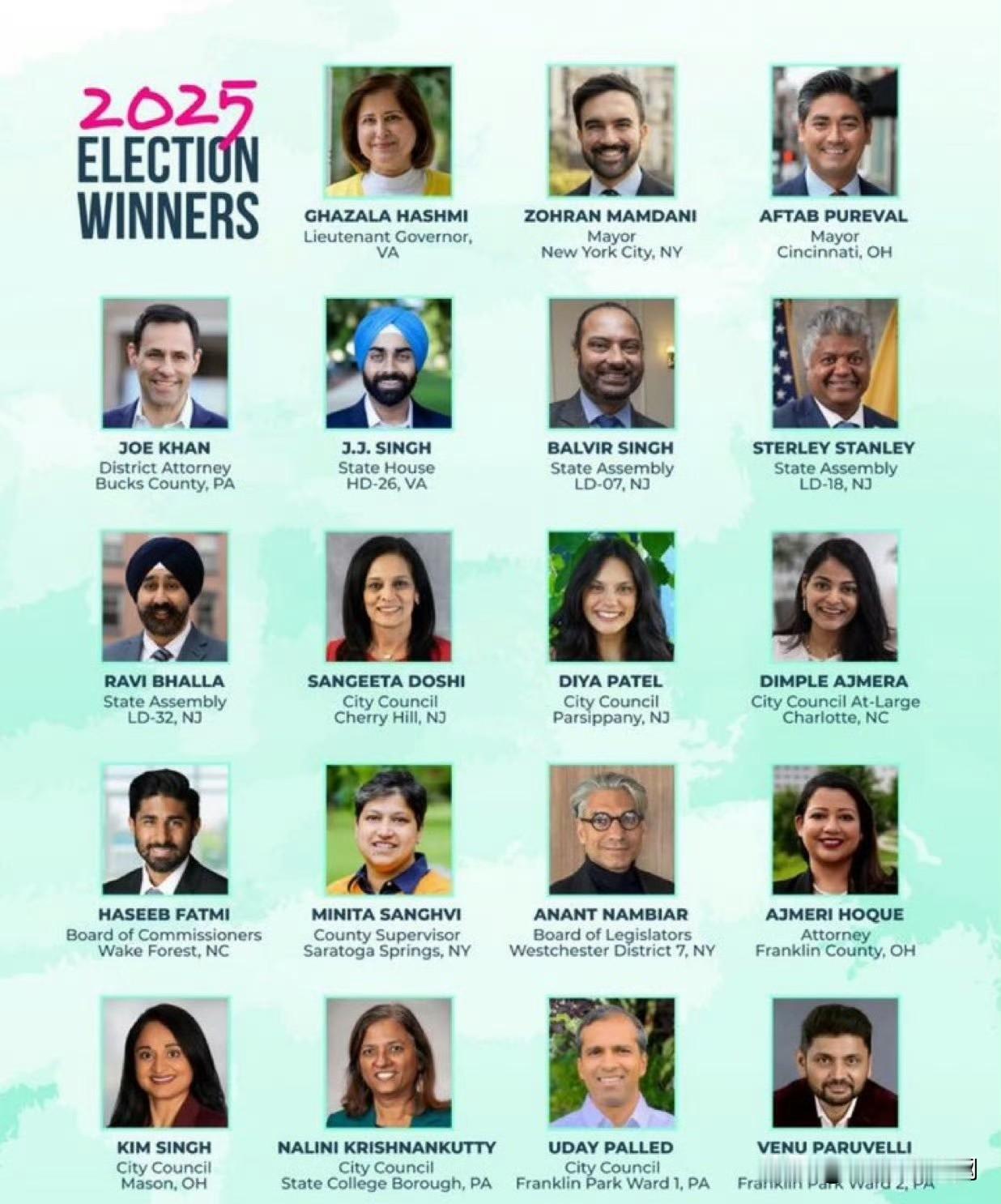 美国正在被悄悄地“征服”! 2025年选举获胜者: 加扎拉·哈什米——弗吉尼亚州副州长 佐兰·曼达尼——纽约市市长 阿夫塔布·普里瓦尔——辛辛那提市长 乔·汗——宾州巴克斯县地方检察官 辛格——弗吉尼亚州第26选区州众议员 巴尔维尔·辛格——新泽西州第7立法选区州众议员 斯特利·斯坦利——新泽西州第18立法选区州众议员 拉维·巴拉——新泽西州第32立法选区州众议员 桑吉塔·多希——新泽西州樱桃山市议员 迪娅·帕特尔——新泽西州帕西帕尼市议员 丁普尔·阿杰梅拉——北卡罗来纳州夏洛特市无党派市议员 Charlotte, NC) 哈西布·法特米——北卡罗来纳州韦克福里斯特市委员 米妮塔·桑格维——纽约州萨拉托加泉县监督员 阿南特·南比亚尔——纽约州威斯特彻斯特第7选区立法委员 阿杰梅里·霍克——俄亥俄州富兰克林县检察官 金·辛格——俄亥俄州梅森市议员 纳利尼·克里希南库蒂——宾夕法尼亚州州学院区市议员 乌代·帕莱德——宾夕法尼亚州富兰克林公园第1选区市议员 维努·帕鲁韦利——宾夕法尼亚州富兰克林公园第2选区市议员