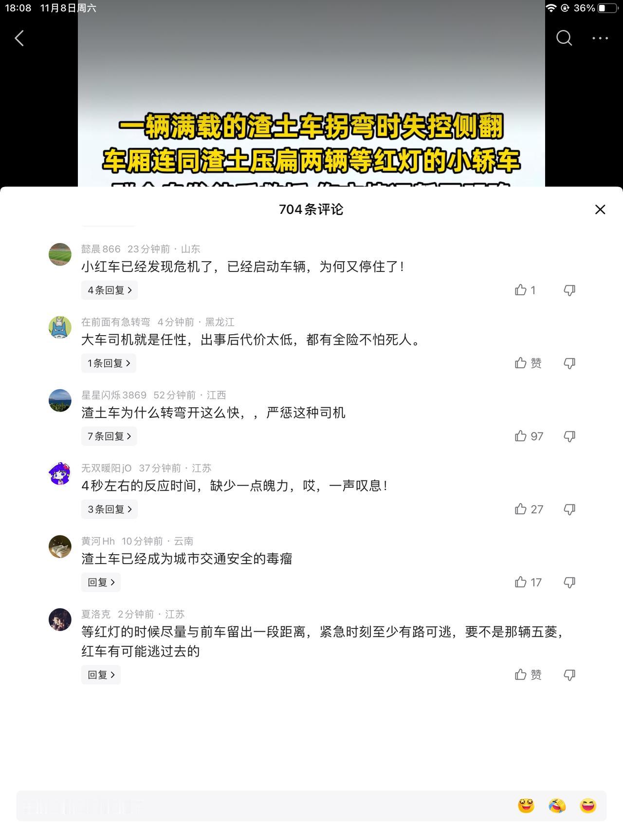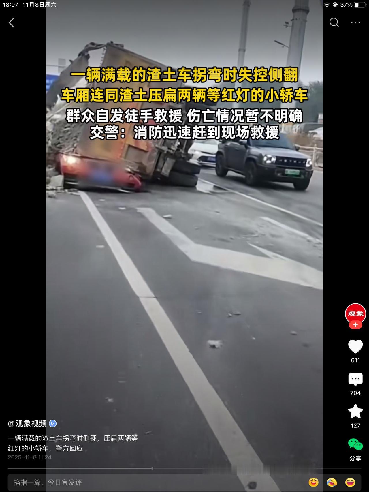 烟台电厂附近这个渣土车拐弯失控埋了两辆车。小红宝马太可惜了!后面车上的人被人拉出来了!应该是没有生命危险。小红就不知道了。 小红从视频里看到它挪动了,明显想冲出车道!后又停住。哎,可惜了。冲出去就是追尾。冲不出去就是被压到土块石块下面。生死未卜。 太可惜了,那一刻,他犹豫了。为小红祈福吧!大车心真大,你开那么快干啥,你面对的是人家的生命。就是说你保险多,你不还有不安吗?对不起人家家属啊!
