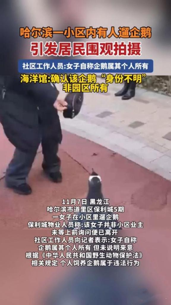 惊!女子竟在小区遛企鹅?社区紧急发声:此举违法!动物保护需重视,违规饲养不可取。你身边有类似“奇特”遛宠现象吗?快来分享,一起探讨合法合规养宠之道,共筑和谐社区。企鹅舞姿