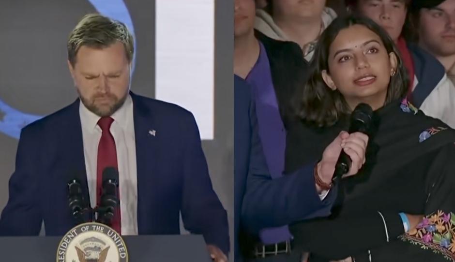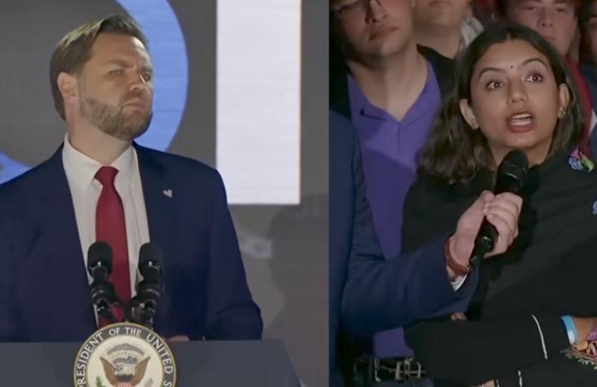 副总统很显然对小姑娘的言论有些不满。 近日,听到副总统要减少美国合法移民的言论,观众席上一位南亚女学生再也忍不住了,她拿起麦克风,用坚定又充满质疑的眼神盯着副总统! 她表示,“美国人兜售给我们一个美国梦,我们把青春和财富都给了这个国家,而你作为副总统,怎么能站在那里说我们太多了?” 听到小姑娘的言论,万斯的脸都绿了,但依然高昂着头,不屑一顾!