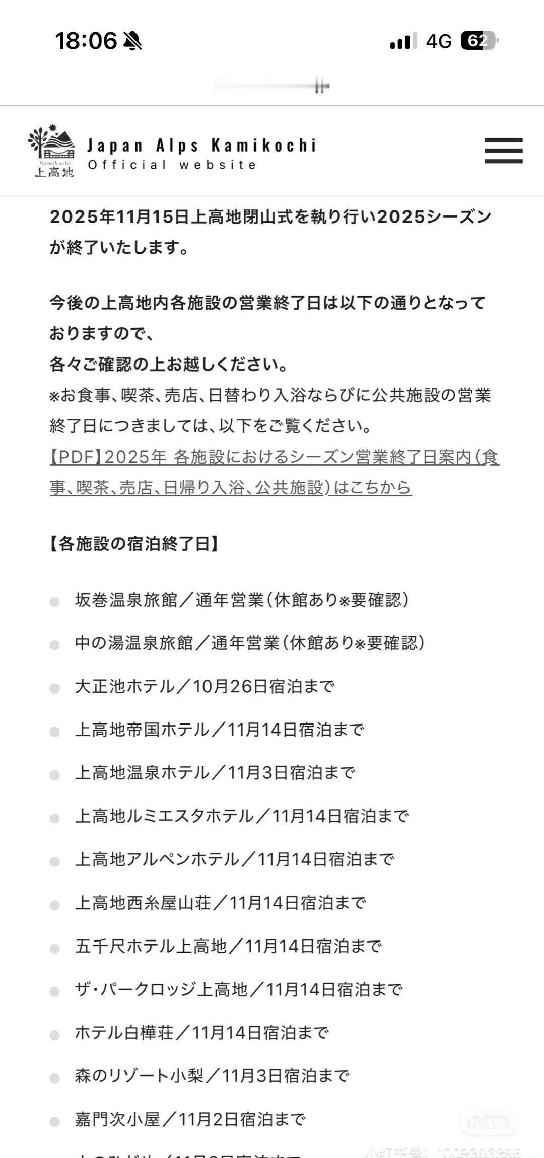兴冲冲期盼着我的上高地徒步呢,今天看到说十一月中封山,妈呀!我 13 号去封山不白盼了吗?赶紧查,说 15 号开始封这运气,有点高兴呢!管它叶子掉光没有呢!图三四五是别人今天的照片,再过五天天会掉光吗? 鬼子吹大牛,阿尔卑斯上高地,我是不信它能跟阿尔卑斯比的 它既然要封山那我得带条棉裤大概得冷!棉裤前两天上泰山我穿过了,除了丑点,没毛病。