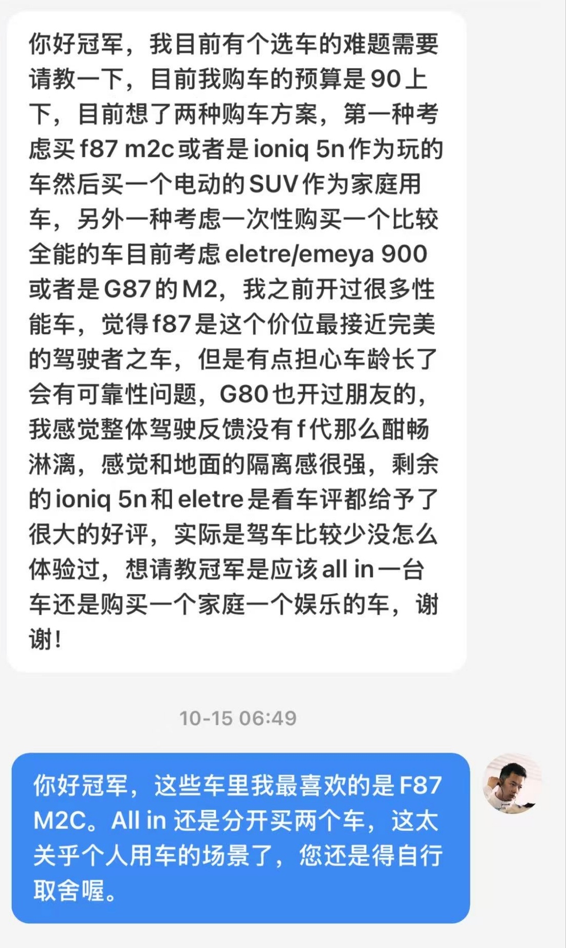 你好冠军,这些车里我最喜欢的是F87 M2C。All in 还是分开买两个车,这太关乎个人用车的场景了,您还是得自行取舍喔。