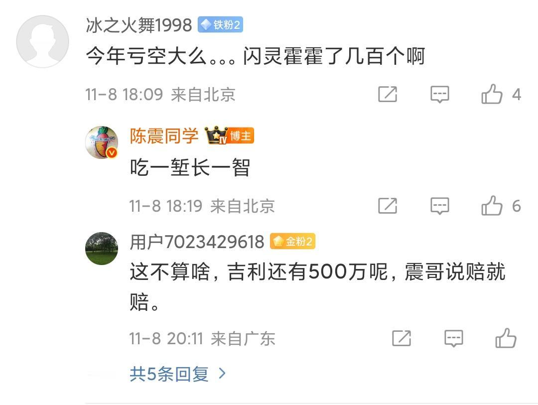 陈震:车圈劳模又双叒叕…出发了~🚅[酷] 网友:今年亏空大了么,闪灵霍霍了几百个呀 陈震:吃一堑长一智。 网友:这不算啥,赔付领克还有500万呢。 陈震这是短途出差呀,平时都是坐飞机,今天坐的高铁还是商务座。 提醒各位网友,在饭点的时候坐商务座,无论是坐了多远都可以吃到饭哟(免费)。[灵光一闪][灵光一闪][灵光一闪][灵光一闪]
