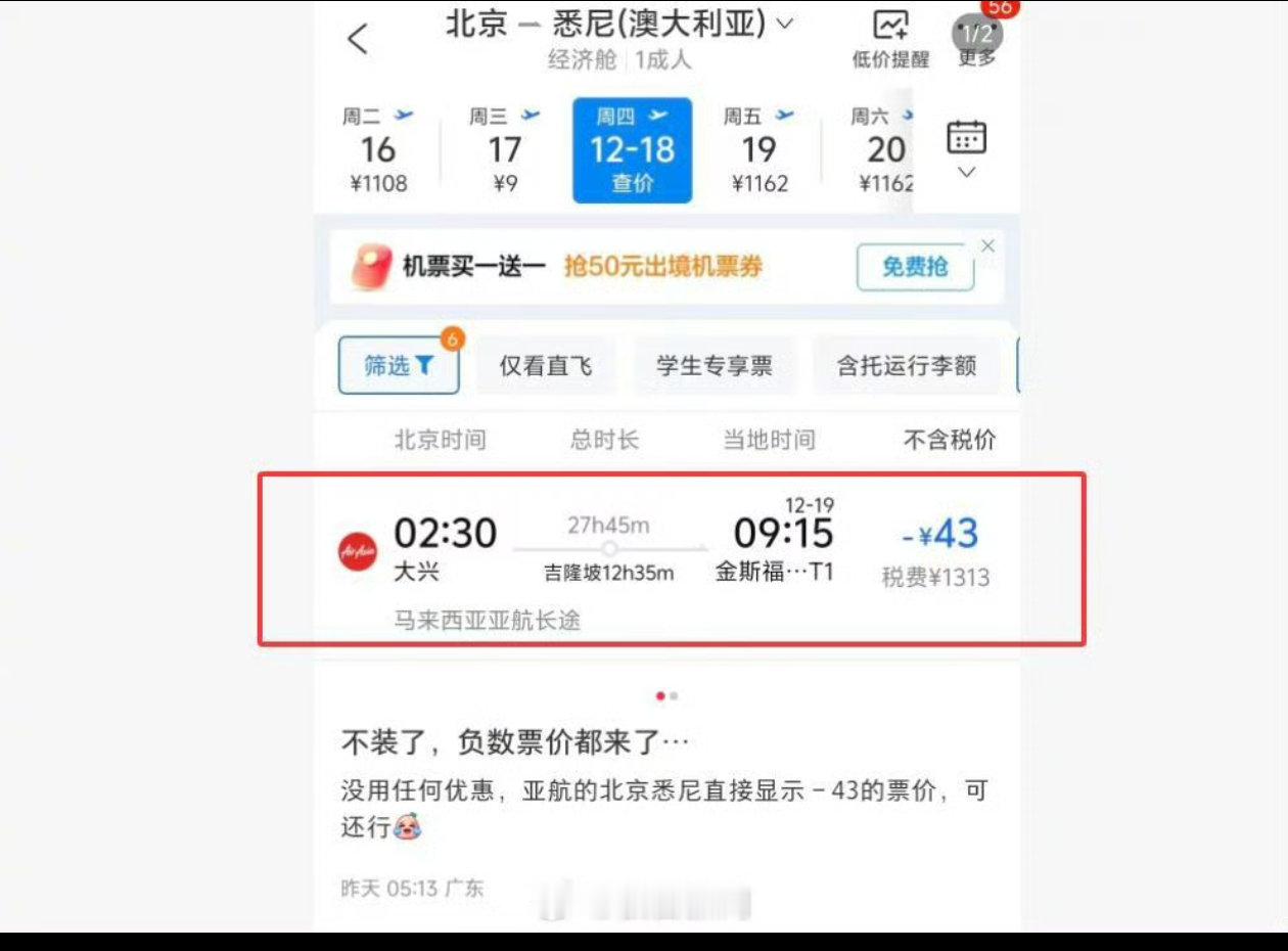 北京飞悉尼航班现负43元票价这应该是打错了吧,不可能出现负数[笑cry][笑cry]