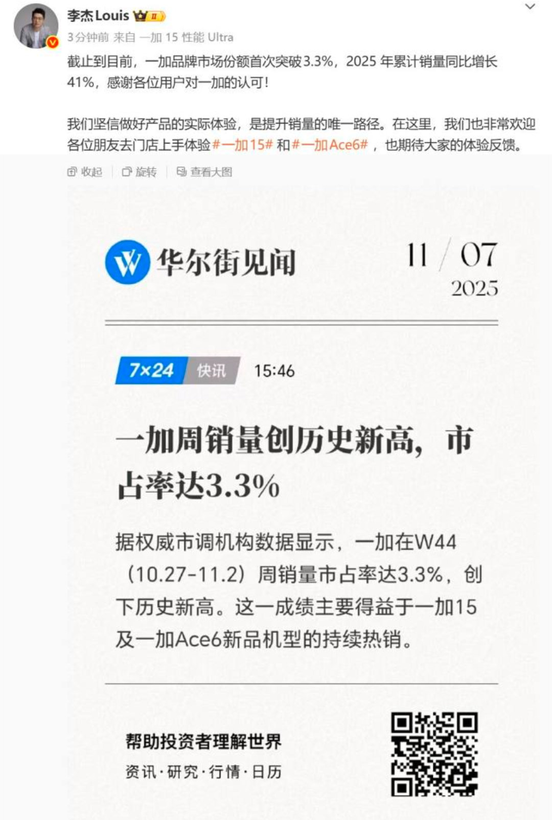 一加中国区总裁李杰确认,截至目前,一加品牌周销量份额(第44周,10.27-11.2)首次突破3.3%,2025年累计销量同比增长41%。